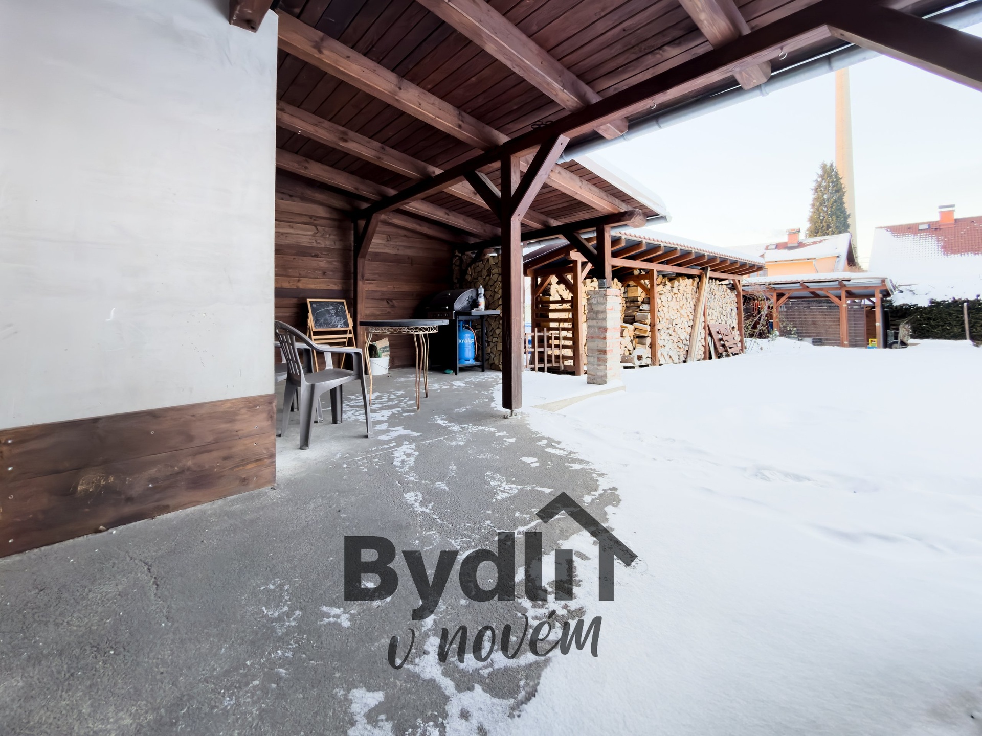 K domu náleží útulná, udržovaná zahrada. Dominantou venkovního prostoru je zastřešená terasa, ideální pro letní snídaně nebo večerní grilování bez ohledu na počasí. Na pozemku se nachází praktický dřevník a pro milovníky psů je připraven bezpečný kotec.