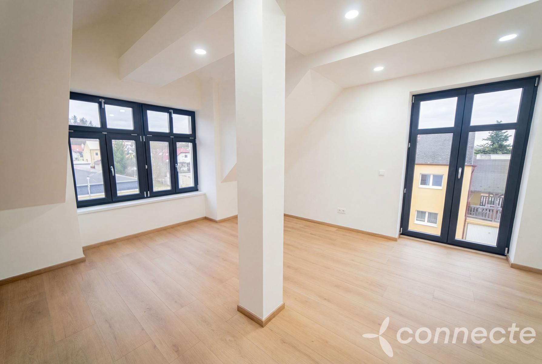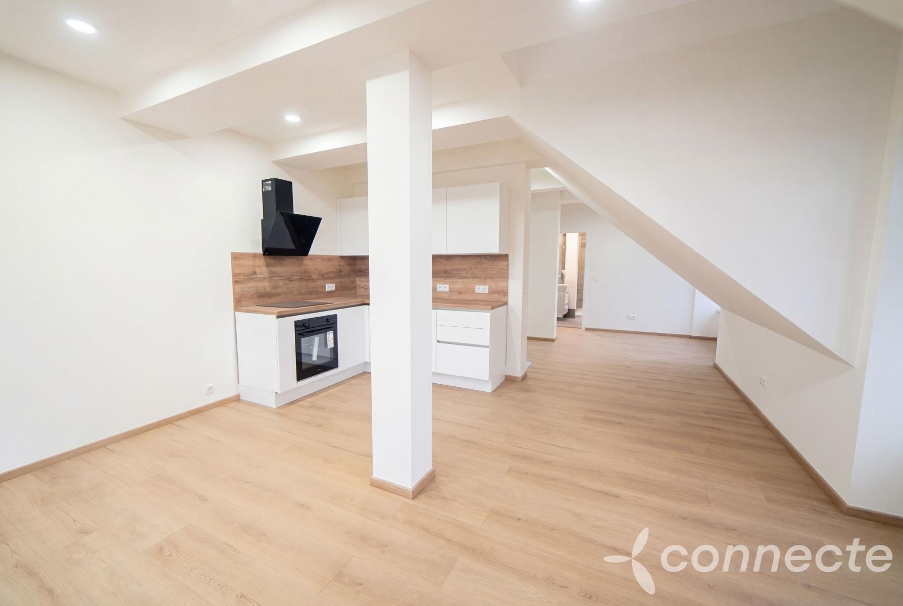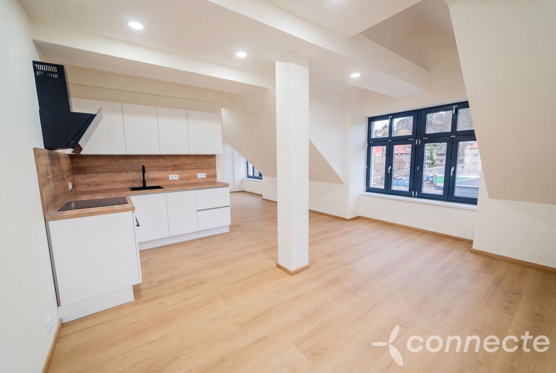 Dispozice: 1+kk, 45,3 m2 + obyvatelná půda 20,7 m2. Obyvatelnou půdu můžete využít jako ložnici, pracovnu nebo sklad.