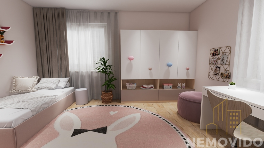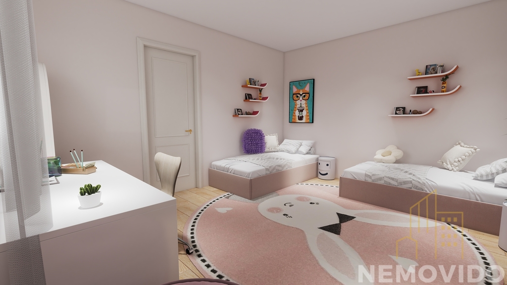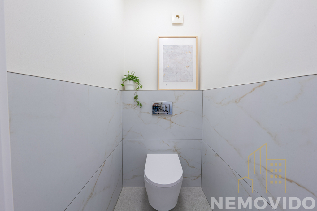 Byt dále nabízí klidnou ložnici s výhledem do zeleně, dětský pokoj nebo pracovnu, moderní koupelnu s kvalitní sanitární keramikou, samostatné WC a prostornou vstupní halu s vestavěnými skříněmi.