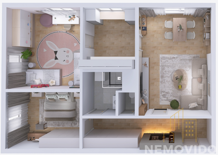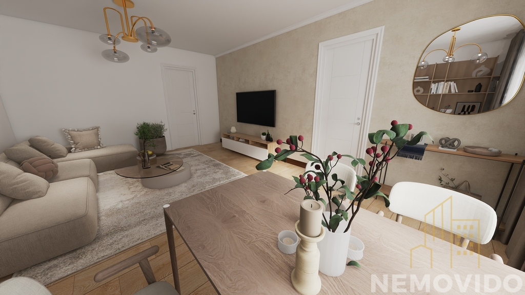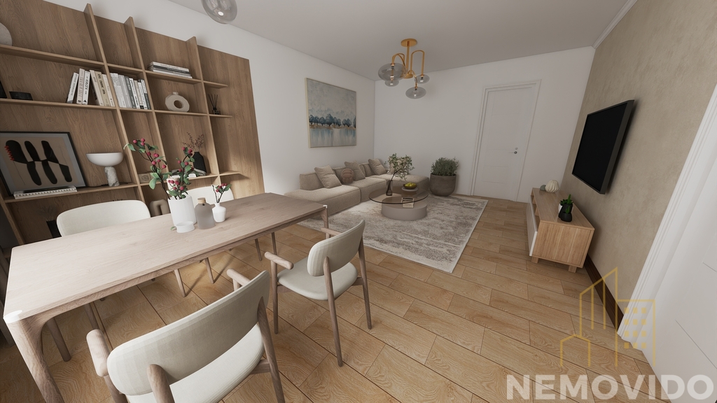 Dominantou bytu je světlý a prostorný obývací pokoj s jídelní částí, který poskytuje dostatek prostoru pro relaxaci i společné chvíle s rodinou.
