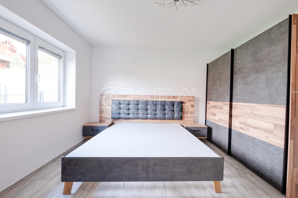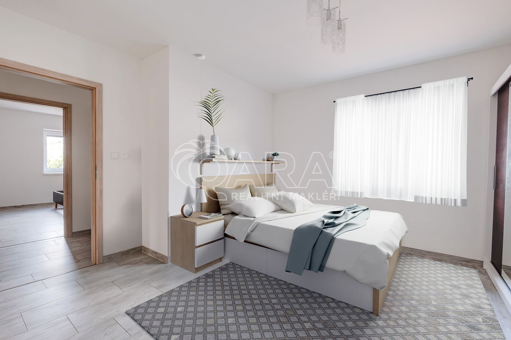 Dispozice: vstupní předsíň, chodba, obývací pokoj s kompletně vybaveným kuchyňským koutem (36 m2) a francouzským oknem se vstupem na částečně zastřešenou terasu s bazénem, dvě ložnice (15 m2), koupelna s vanou a WC, technická místnost s bojlerem; z chodby je vstup po výsuvných schodech na půdu s úložným prostorem, pod terasou je menší sklad na zahradní potřeby.