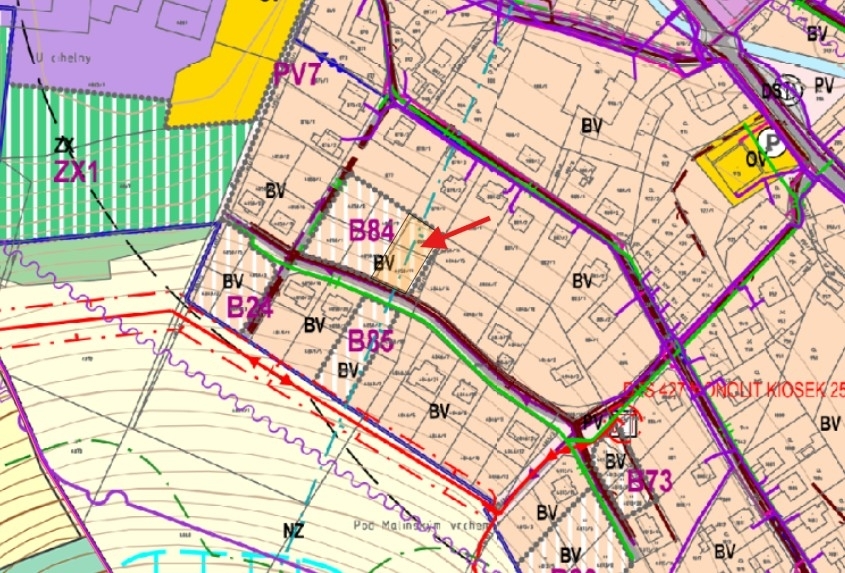 Stavební pozemek v zastavitelné ploše B84 – bydlení v rodinných domech (BV). Pozemek se nachází v zastavitelné ploše č. B84 s funkčním využitím BV – plochy bydlení v rodinných domech (venkovské). Hlavní využití je určeno pro výstavbu rodinného domu s individuálním bydlením. Územní plán nestanovuje maximální procento zastavěnosti – konkrétní záměr tedy bude posuzovat stavební úřad. Výšková regulace umožňuje výstavbu až 2 nadzemních podlaží, tedy jak bungalov, tak klasický dvoupodlažní dům. Nová výstavba má respektovat charakter okolní zástavby – v lokalitě převažují sedlové a valbové střechy, které by měly být zachovány i u nových domů. Uliční čára není pevně stanovena, ale vychází se z místního urbanistického uspořádání – domy jsou zde obvykle umisťovány v přední části pozemků, zatímco zadní část slouží jako zahrada. Další výhodou je jasné pravidlo, že podél komunikace je přípustná pouze jedna řada rodinných domů – za první řadou již další výstavba není možná. Budoucí soukromí tak zůstává zachováno. Ideální příležitost pro ty, kdo chtějí stavět rodinný dům v klidné lokalitě s jasně nastavenými pravidly a bez rizika zahušťování zástavby v budoucnu.