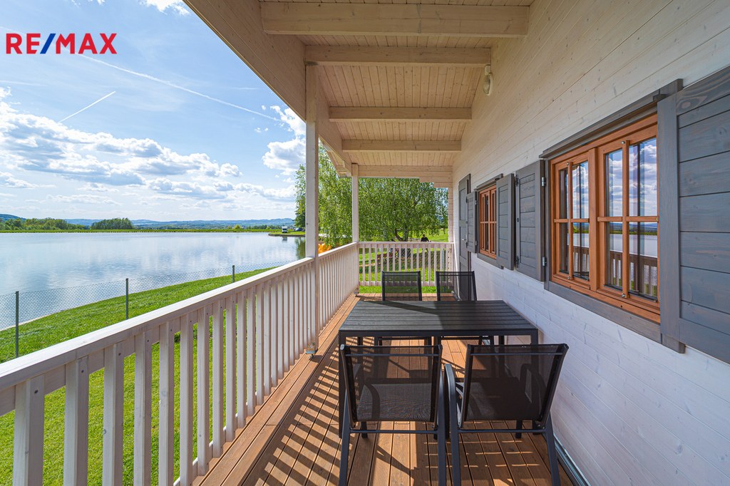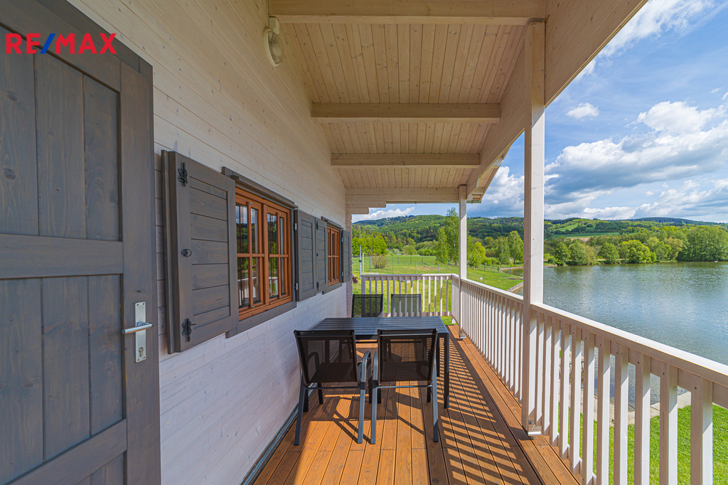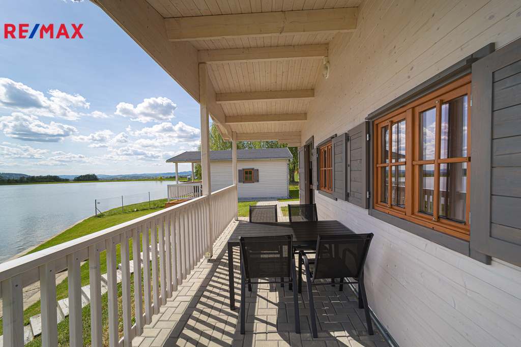 Terasa - Každá chatka má zastřešenou terasu (10 m²) s relaxačním výhledem přímo na hladinu přehrady.