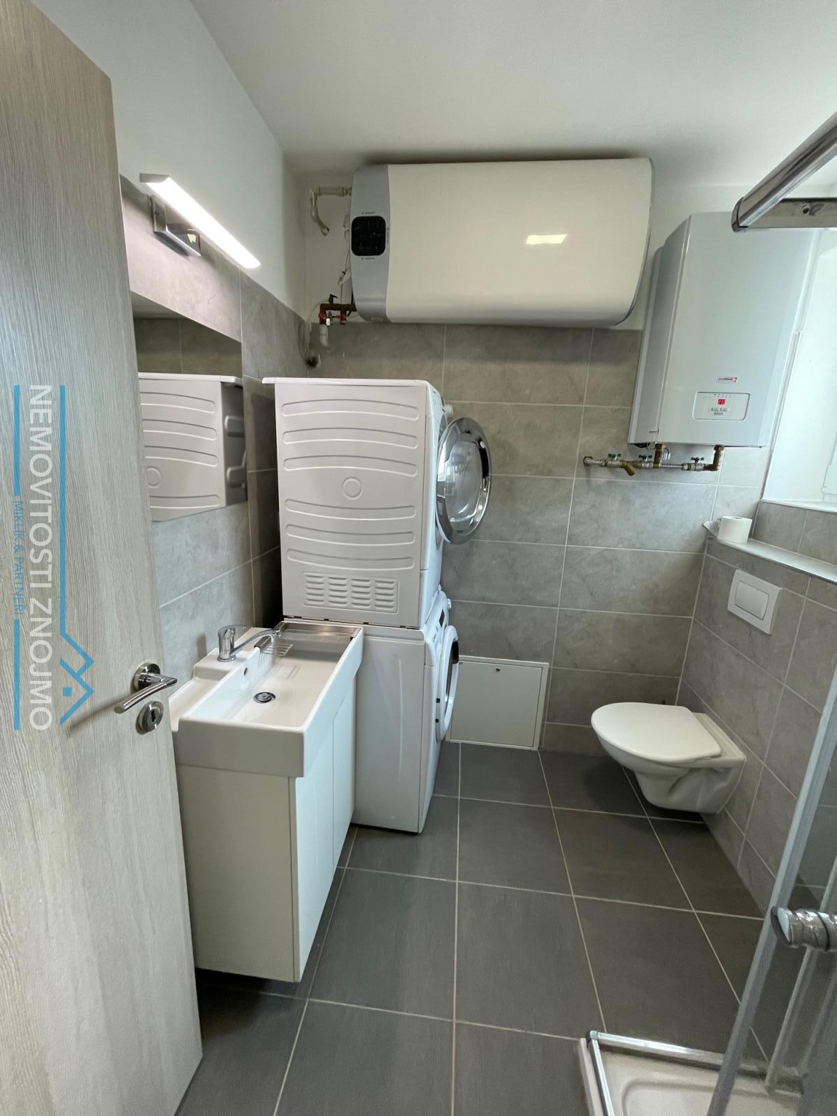 b.) koupelna se sprchovým koutem, toaletou, přípojkou na pračku a umyvadlem