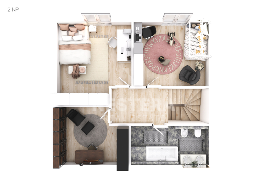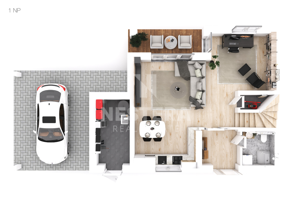 První nadzemní podlaží je věnováno prostorném obývacímu pokoji s kuchyňským koutem, odkud je velkými francouzskými okny vstup na jižně orientovanou, slunnou terasu. Dále se v přízemí nachází koupelna s WC, zádveří, technická místnost a dle projektu je možné zde jednoduchým umístěním 2 příček dokončit samostatný pokoj s vlastním vstupem na terasu. V patře na vás budou čekat další 3 ložnice a koupena s WC.