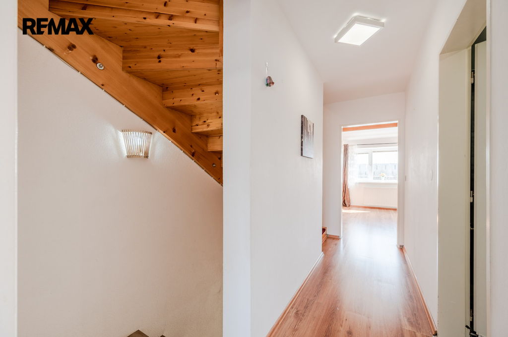 V přízemí domu je obývací část se vstupem na zahradu, kuchyňský kout včetně moderních spotřebičů a jídelního stolu, vstupní chodba a samostatná toaleta. Z obývací části je vstup na zimní zahradu, která Vám umožní příjemné posezení i v nepříznivém počasí s příjemným výhledem do zahrady. V prvním patře jsou dva pokoje, kdy v jednom z nich je ještě dřevěné patro, a tím vytváří dojem ateliéru (ideální jako výjimečný studentský pokoj). V tomto patře je také koupelna s velkým moderním sprchovým koutem. Ve druhém patře je prostorná ložnice. Díky členitosti a rozdělení pokojů najde v tomto domě dostatek soukromí každý člen rodiny.