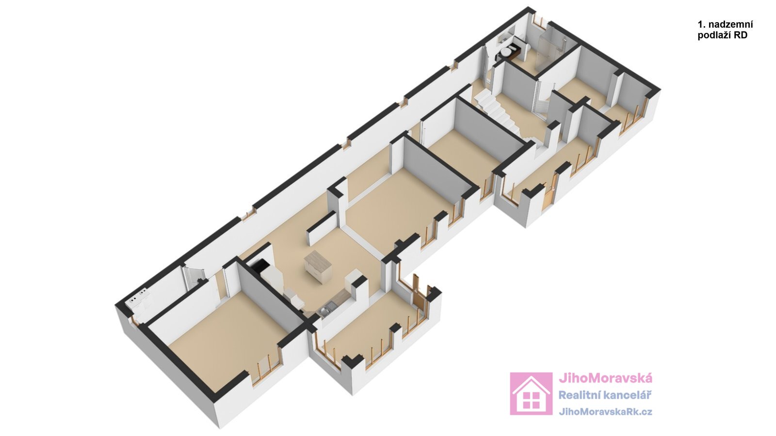 přízemí: předsíň, chodba, pokoj, koupelna s WC (sprchový kout), chodba, pokoj, jídelna, zimní zahrada, kuchyň, chodba, pokoj a technická místnost s WC.