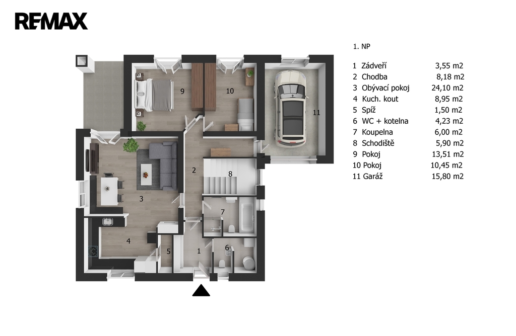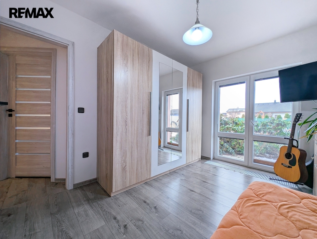 Přízemí (103 m²) je dokončené – nachází se zde prostorný obývací pokoj s kuchyňským koutem, dvě samostatné ložnice, koupelna, technická místnost a garáž. Celé patro má podlahové vytápění včetně garáže.