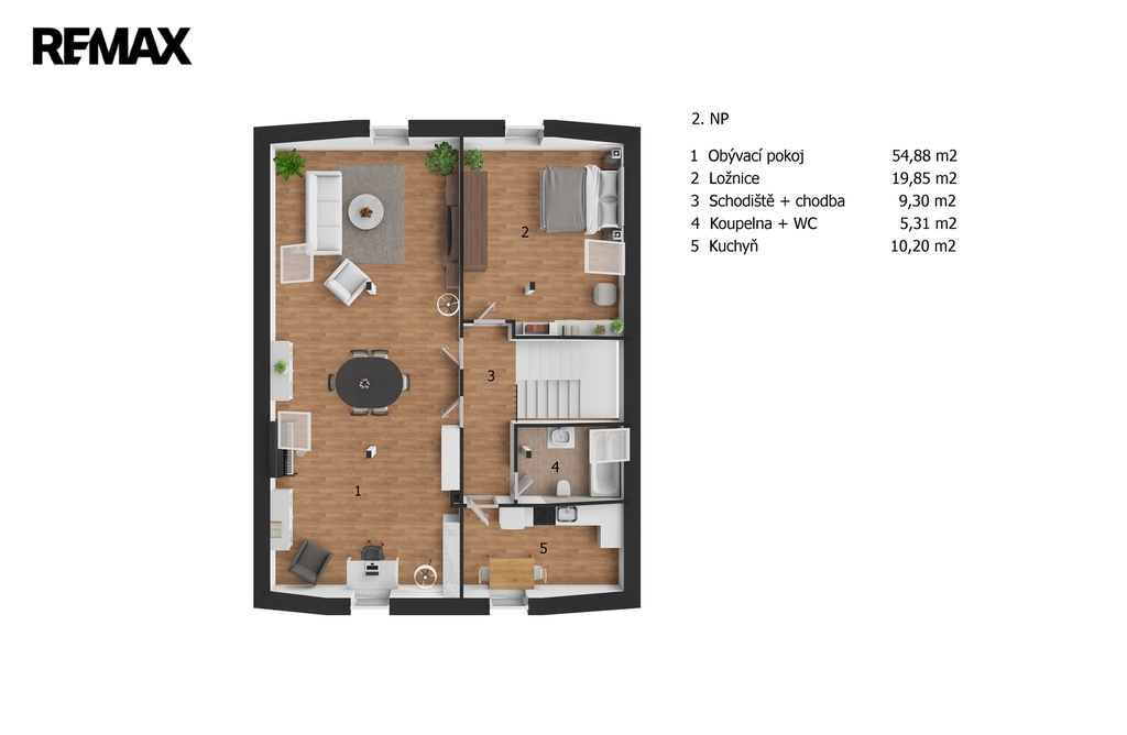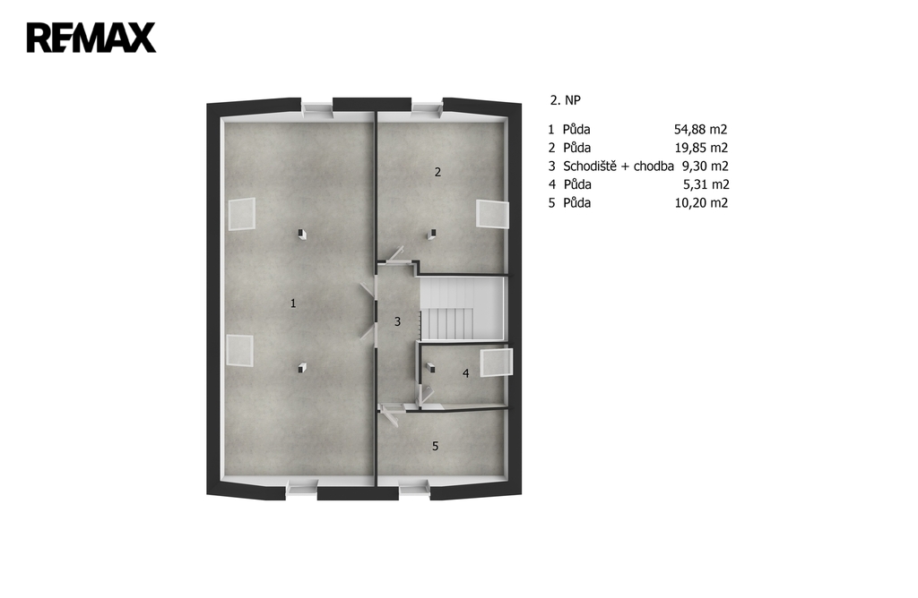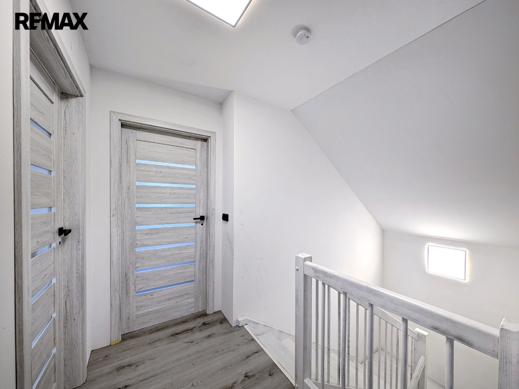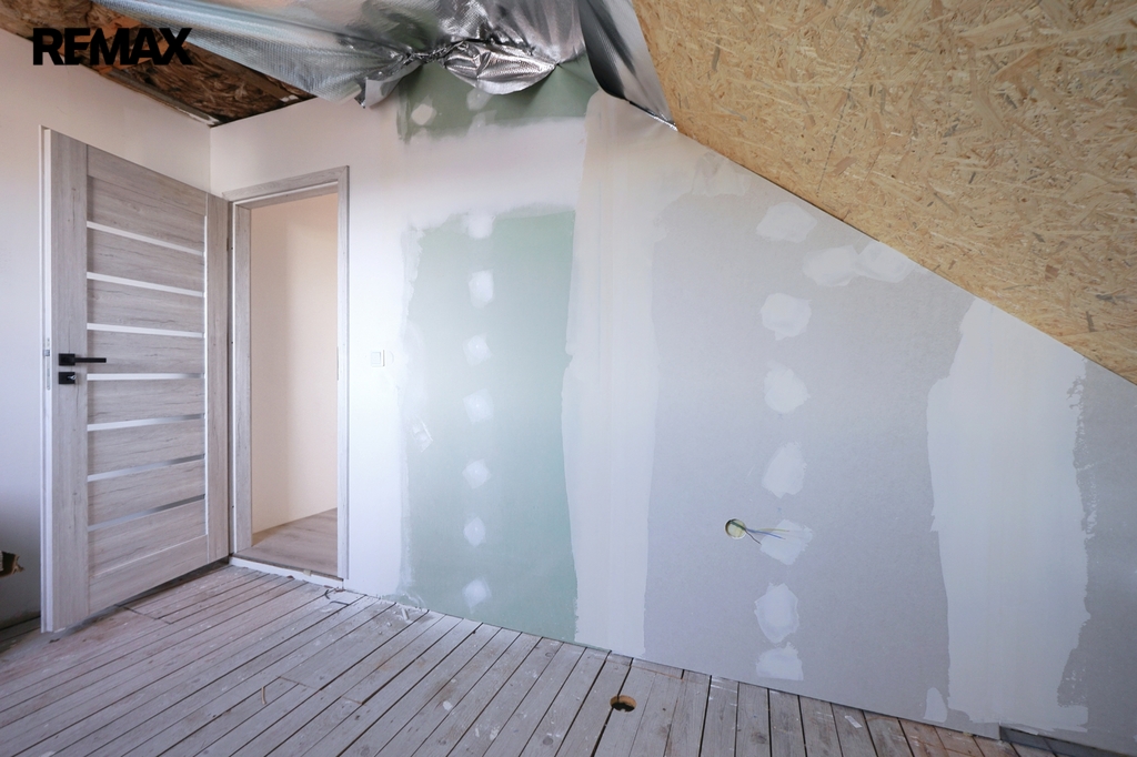 Horní patro je aktuálně kolaudováno jako půda a je ve fázi rekonstrukce na obytný prostor. K prodeji budou kolmé stěny zatelpeny a natáhnuté sádrokartonem. V 2NP se nachází zateplení a jsou zde umístěna okna včetně těch střešních, zároveň je zde připravena podlahová krytina na celý vršek bez koupelny. Lze zde vybudovat až tři obytné místnosti a samostatnou koupelnu podle vlastních představ. Druhé patro nabízí možnost až 90 m². Horní patro je připraveno k dokončení dle vlastních představ budoucího majitele. Odhad nákladů na dokončení cca 200 000 Kč