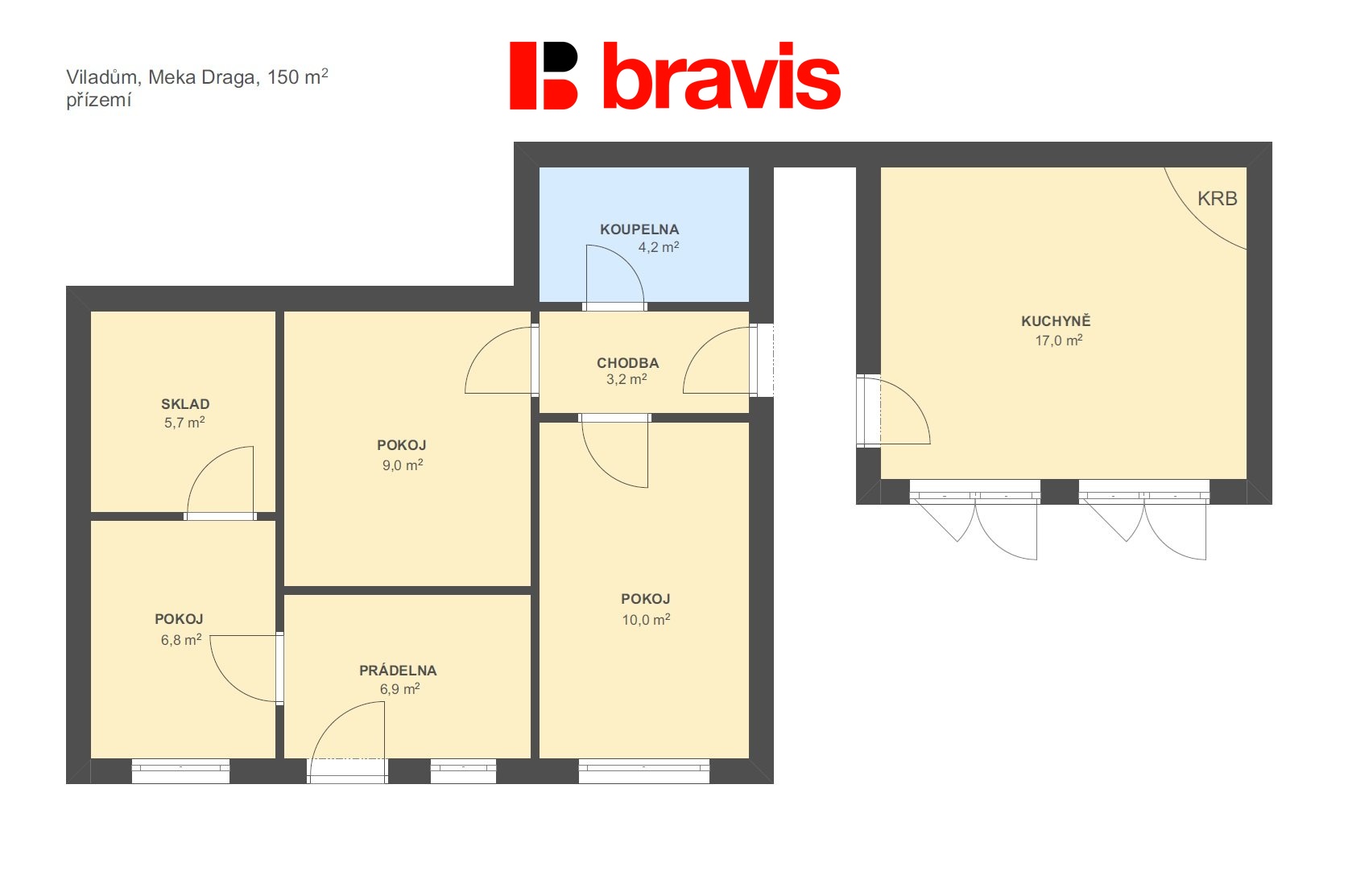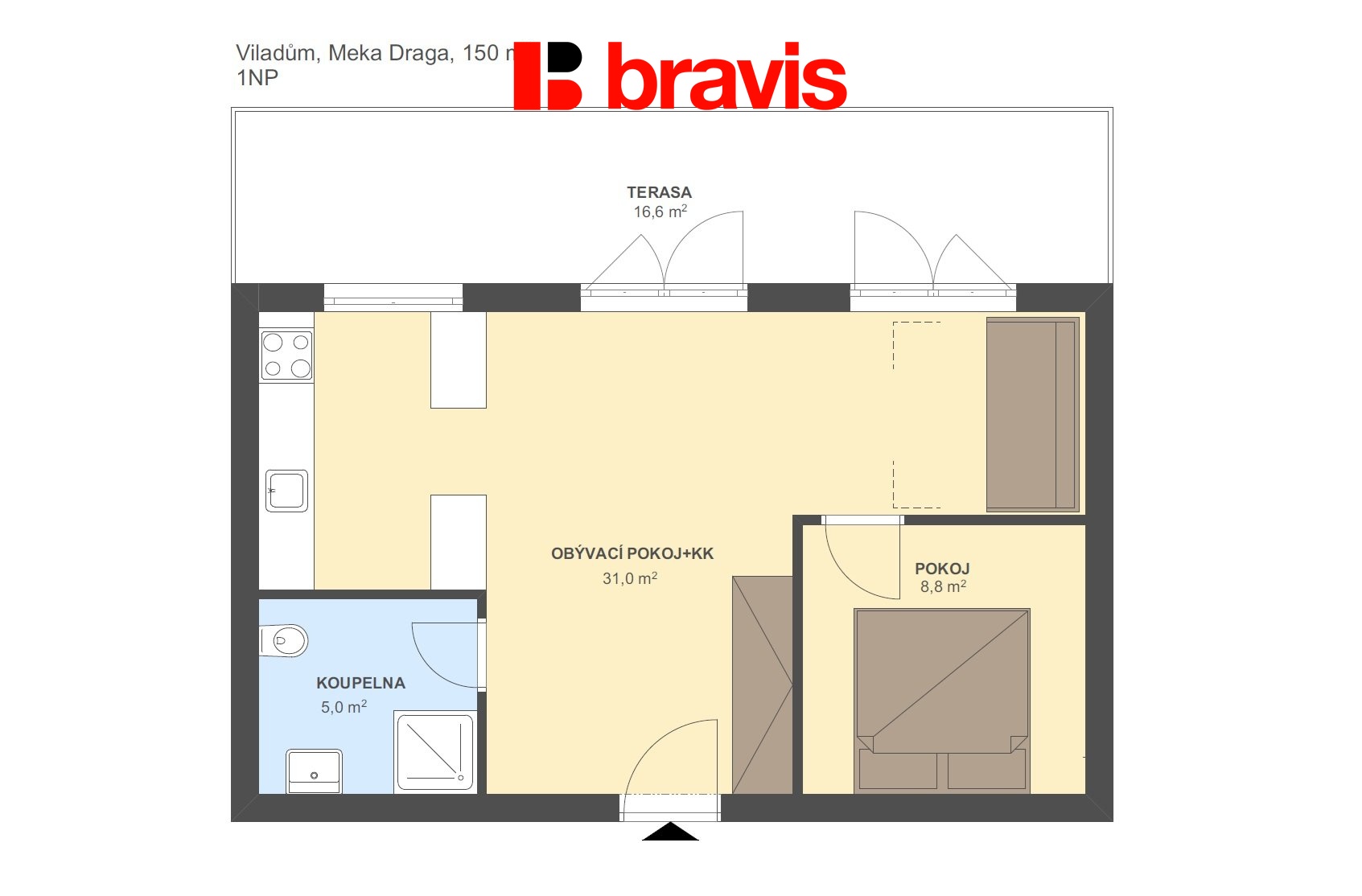 • dva pokoje, koupelna/WC, kuchyň, velká terasa s posezením, grilem a relaxační částí, dále pak technické zázemí (prádelna, menší pokojík/sklad a sklep).