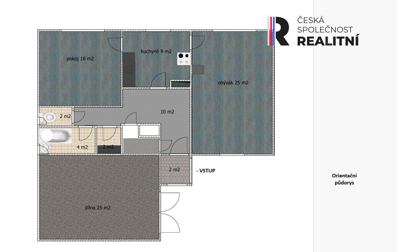 Obytná část o zastavěné ploše cca 88m2 disponuje třemi místnostmi, špajzkou a halou (viz. půdorys).