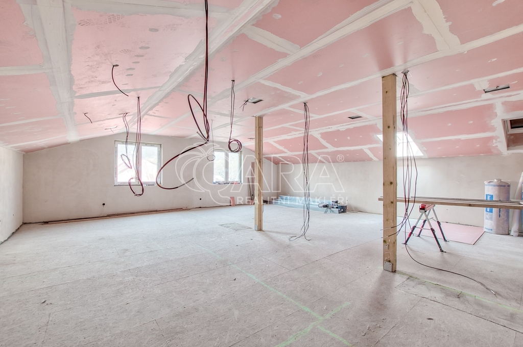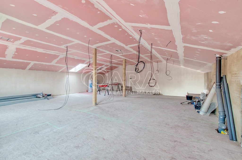 Technický stav? Výborný. Stavba z roku 1945 prošla v posledních letech důkladnou rekonstrukcí. V roce 2022 se obnovilo první patro, v roce 2023 vznikl prostor ve třetím podlaží. Nová střecha, kvalitní plechová krytina, střešní okna Velux s izolačním trojsklem. Vytápění řeší tepelné čerpadlo značky Nibe o výkonu 12 kW, k tomu zásobník na teplou vodu. Všechny rozvody jsou nové – elektřina, voda, odpady. A podlaha v nejvyšším patře? Odhlučněná, izolovaná vatou a opatřená dvojitým záklopem z OSB desek.