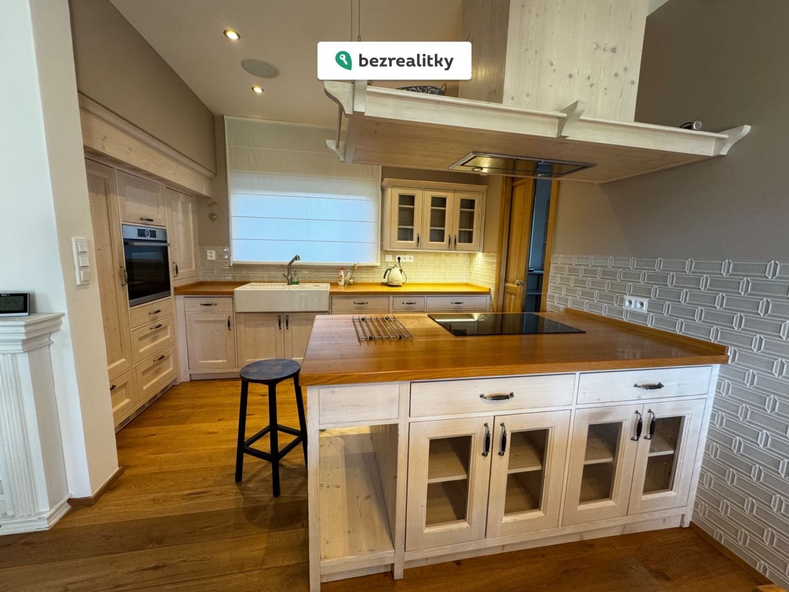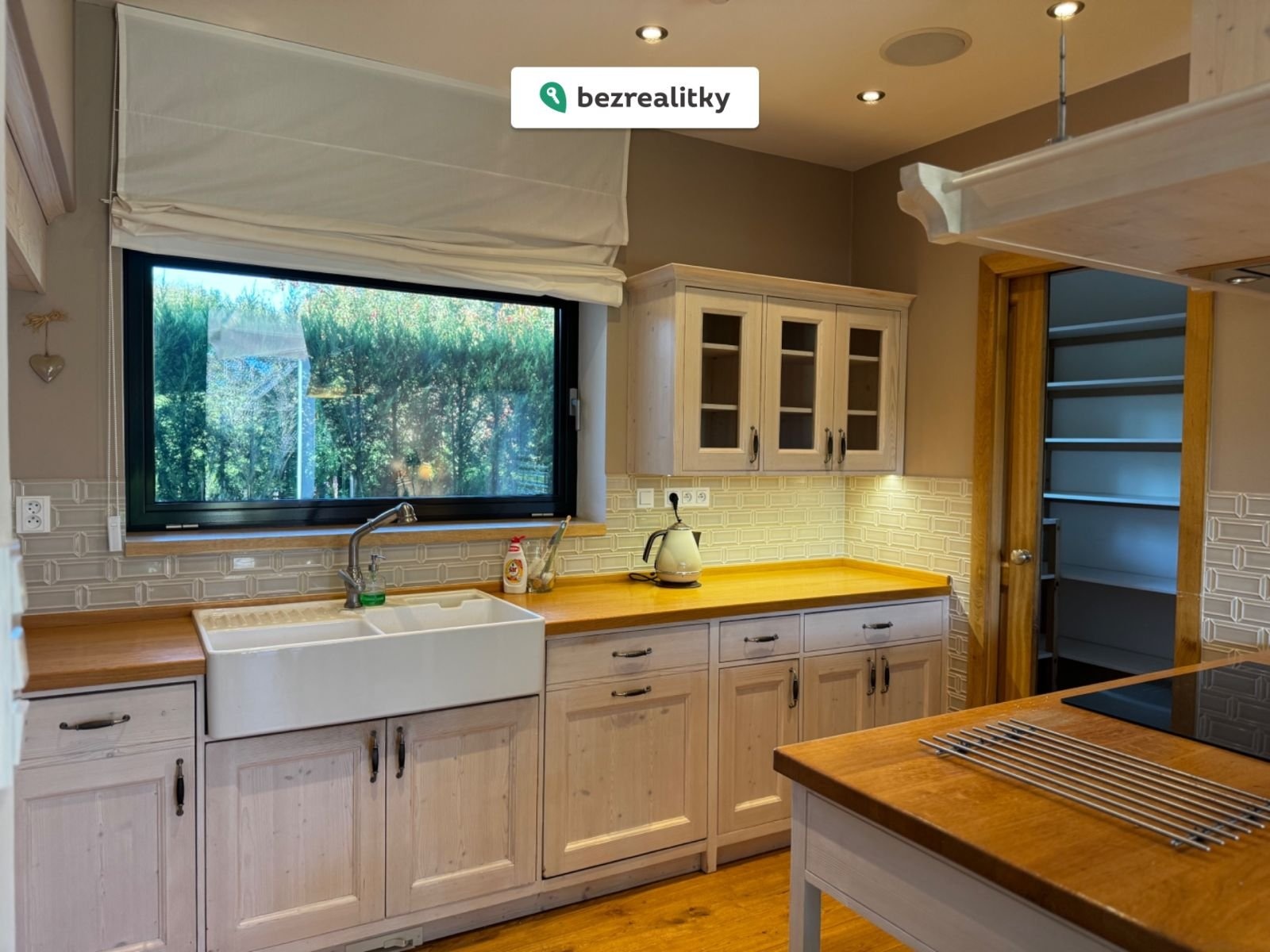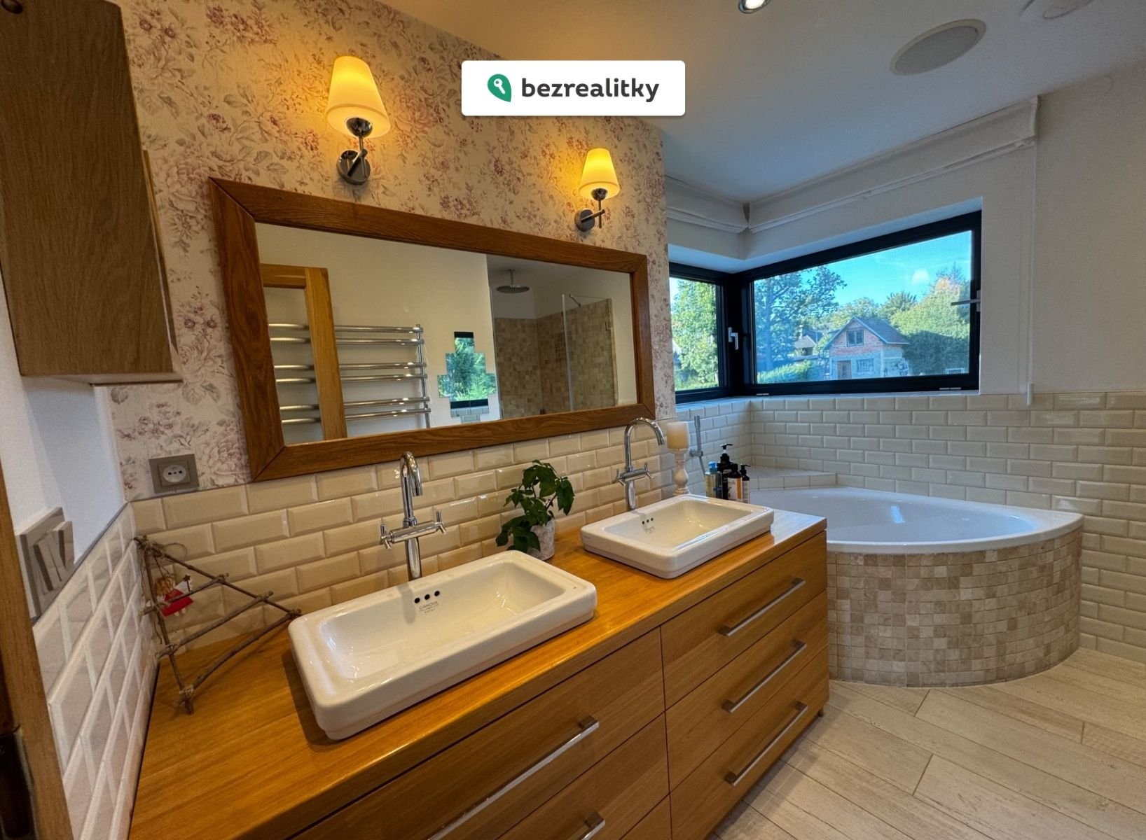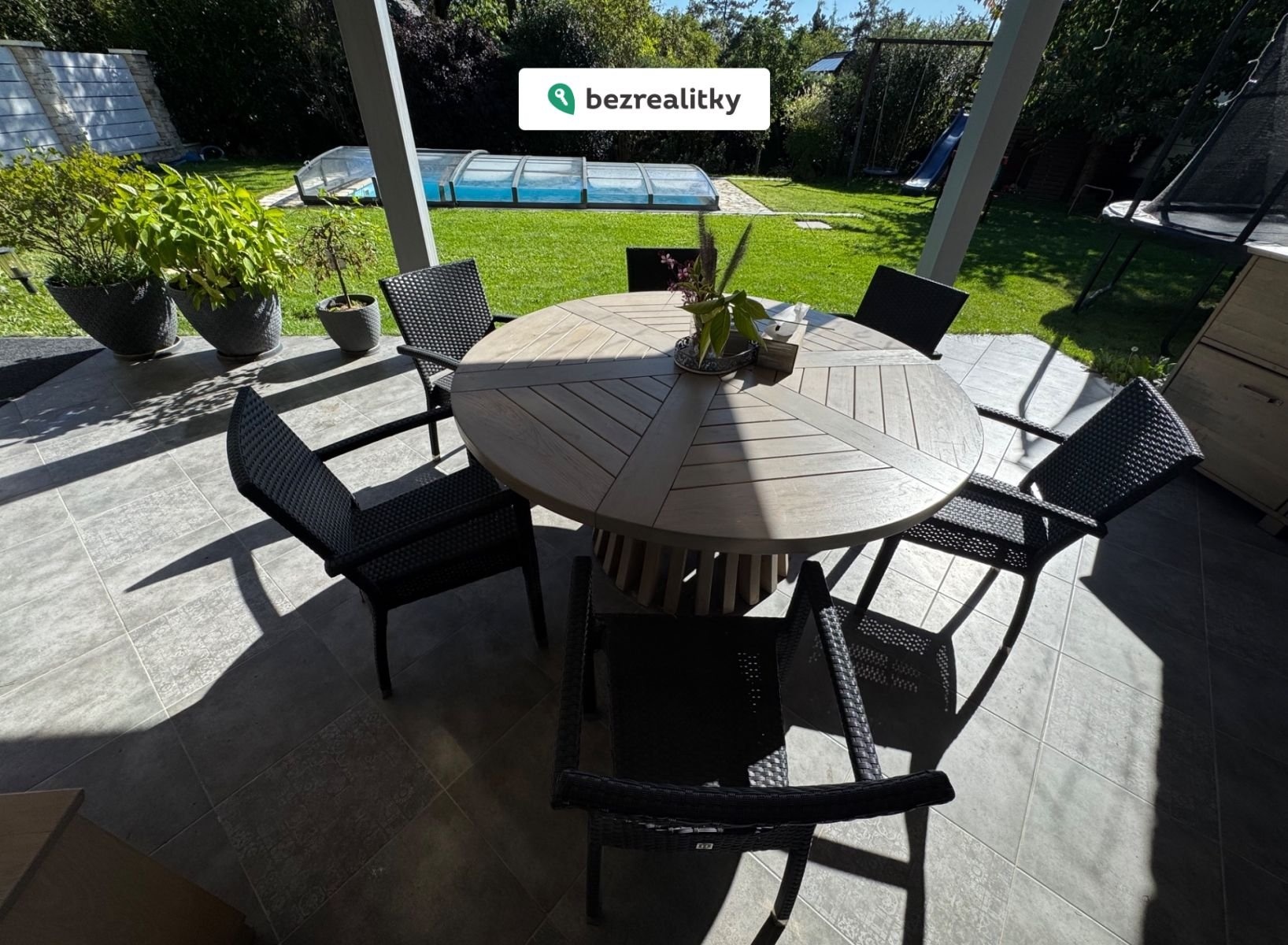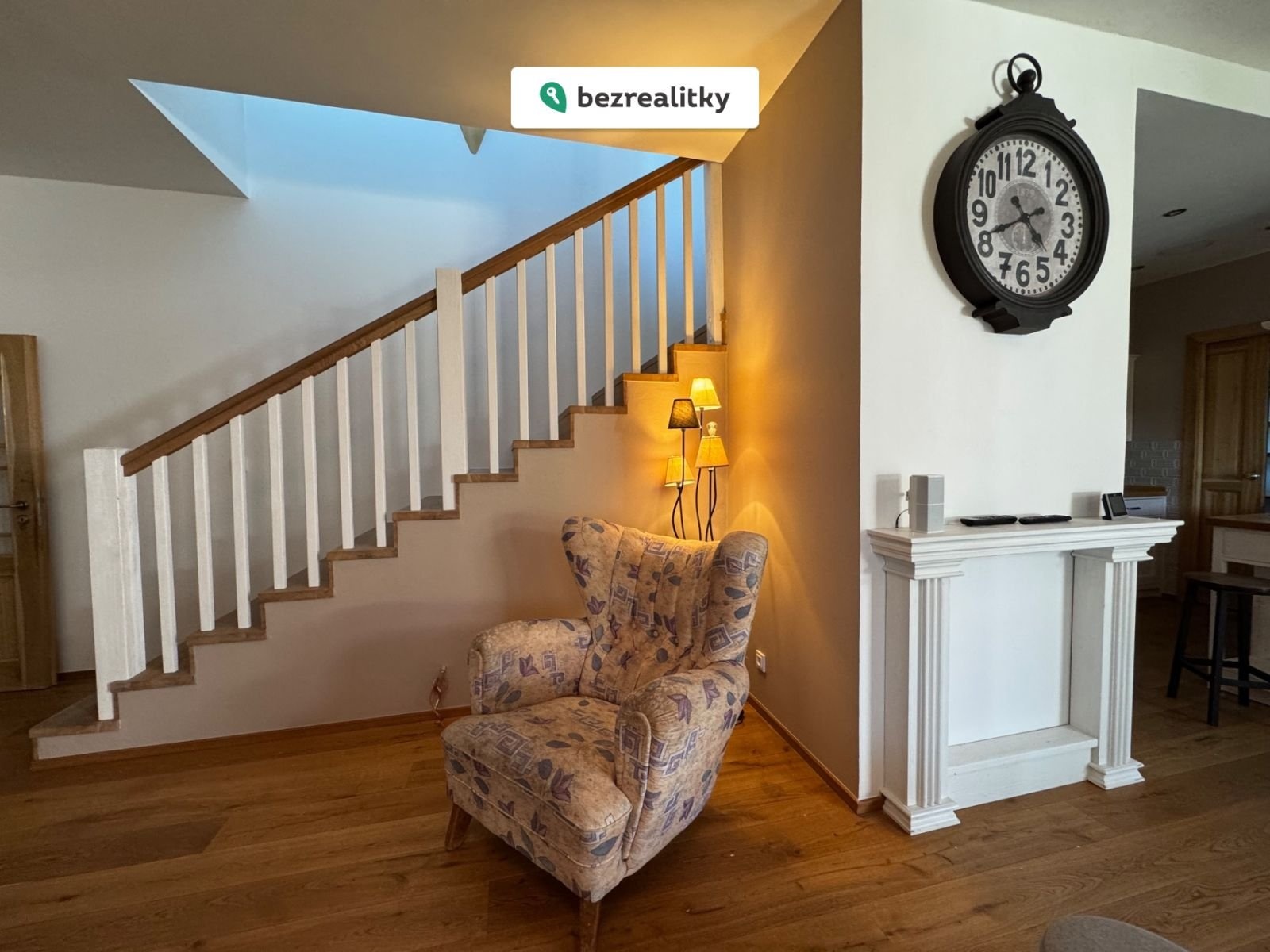 Masivní dřevěné podlahy, nadstandardní výška stropů, velké hliníkové prosklené plochy a propojení obytného prostoru se zahradou pomocí HS portálů dodávají domu světlost, vzdušnost a nadčasovou estetiku. Ihned k nastěhování.