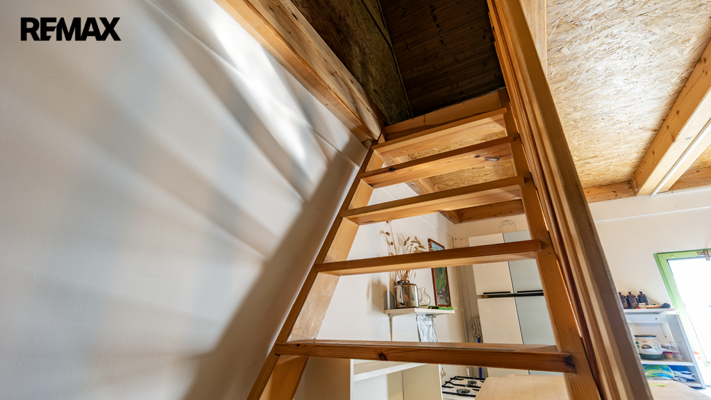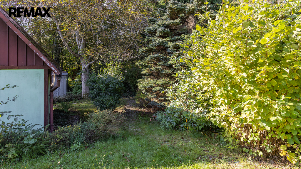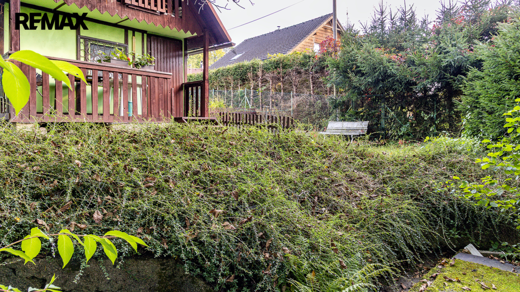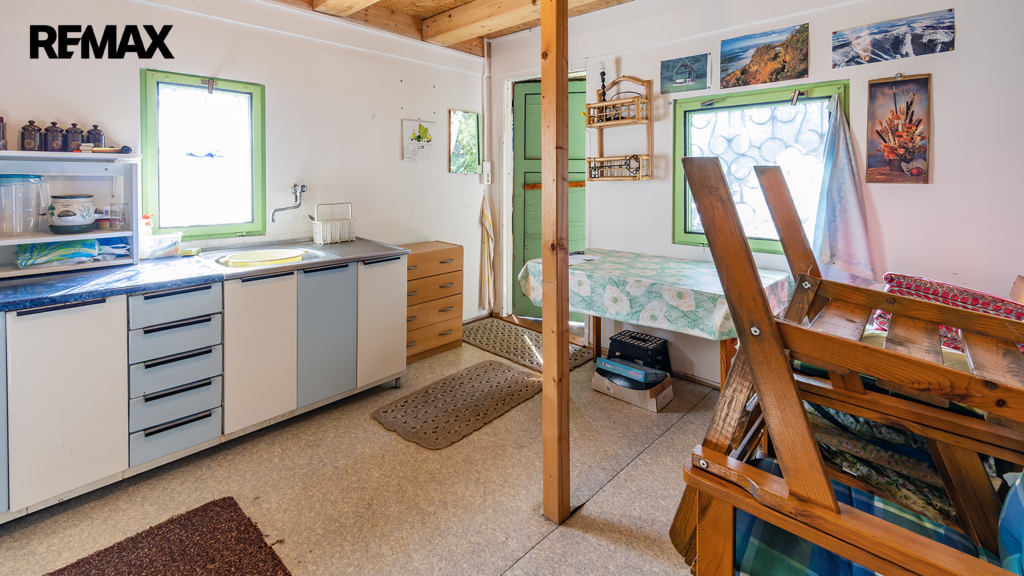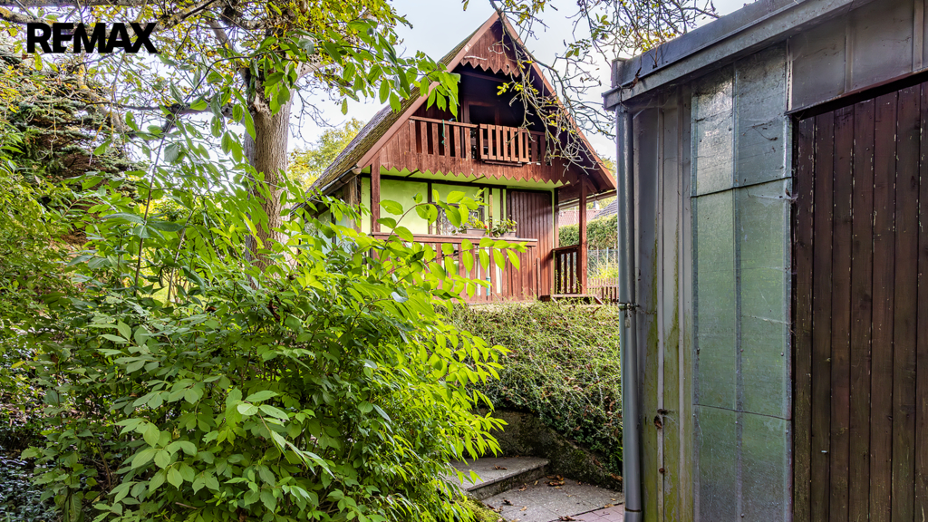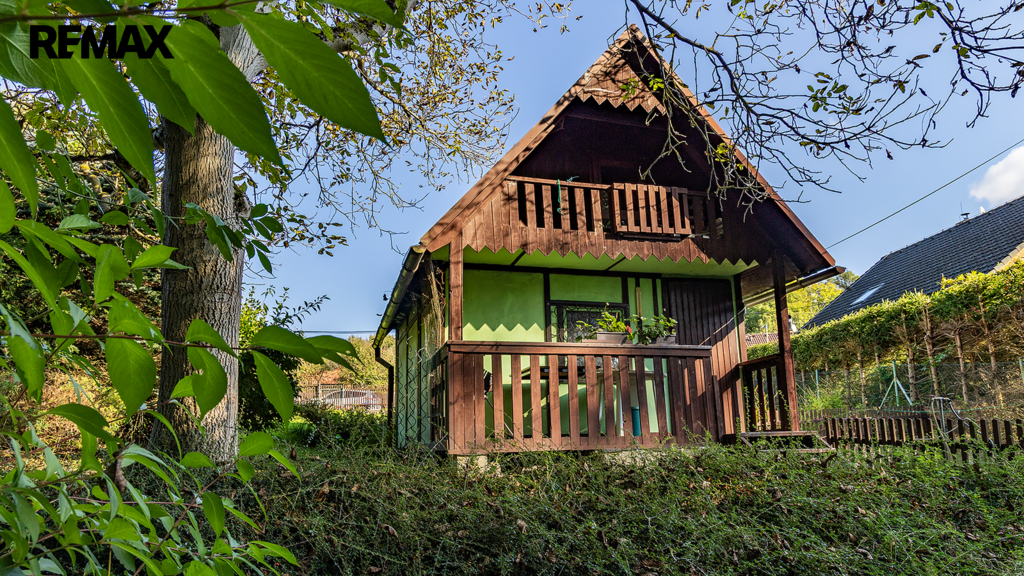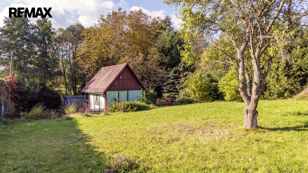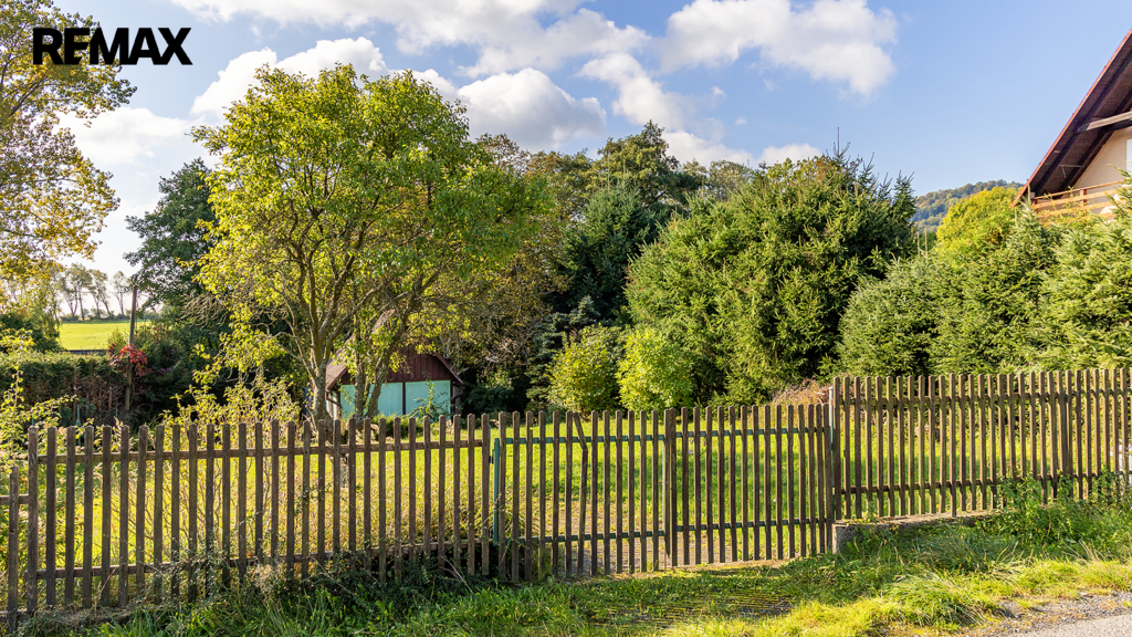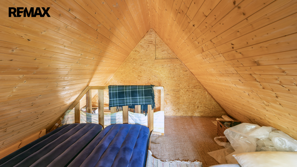 Na pozemku resp. v jeho zadní části v tuto chvíli stojí jednoduchá dřevěná chata (nikoliv na místě předpokládané budoucí stavby RD), která může ještě dál sloužit k občasnému rekreačnímu nebo sezónnímu využití, ale hlavně vám poskytne praktické zázemí během samotné výstavby domu – místo na nářadí, přístřešek při špatném počasí, zázemí pro dohled na stavbu apod.
