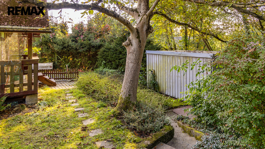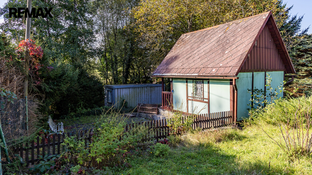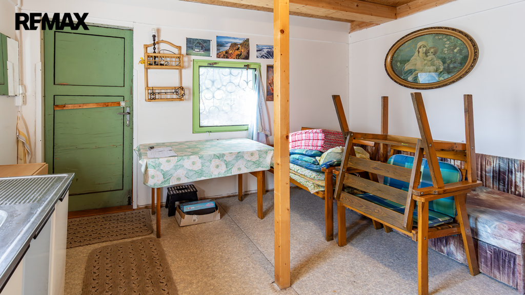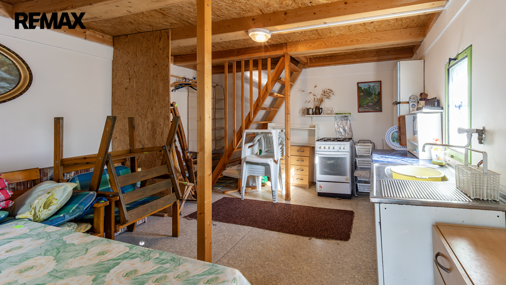 Důležité upozornění: tato chata není zapsaná v katastru nemovitostí jako stavba. To znamená, že ji vnímáme spíše jako dočasný objekt (provizorní zázemí), nikoliv jako plnohodnotnou rekreační stavbu. Na okraji pozemku je dále umístěn kontejner sloužící jako sklad. Ideální na materiál, nářadí, zahradní techniku atd. V praxi to znamená, že když začnete stavět, nemusíte první den řešit, kam s věcmi. Máte to připravené.