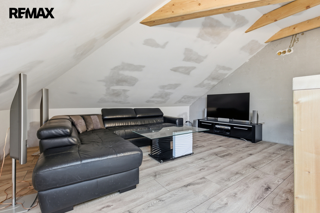 První jednotkou je rohový mezonet 3+kk o podlahové ploše 114 m² s pozemkem o výměře 49 m² a předzahrádkou 15 m², která je pronajata od obce. V přízemí se nachází kuchyně, obývací pokoj a koupelna s exkluzivní dlažbou. V patře jsou dvě ložnice a chodba. Byt je vybaven vinylovými podlahami, kvalitními střešními okny Velux s trojskly, samostatným měřením a jímkou o objemu 9 m³. Parkování je možné před domem.