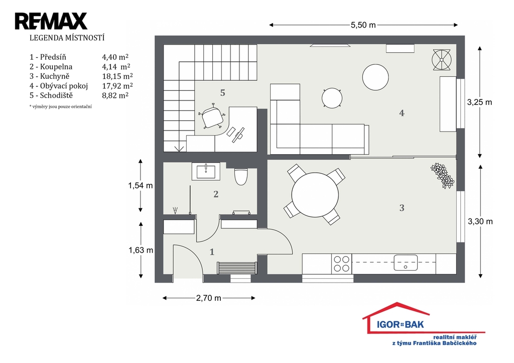 V přízemí je předsíň (4,40 m²), koupelna se sprchovým koutem a toaletou (4,14 m²) s velkoformátovou, exkluzivní dlažbou, dále kuchyně (18,15 m²), obývací pokoj (17,92 m²) a schodiště (8,82 m²).