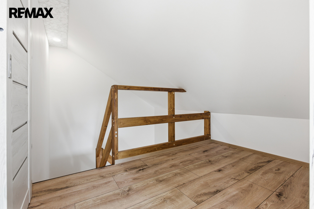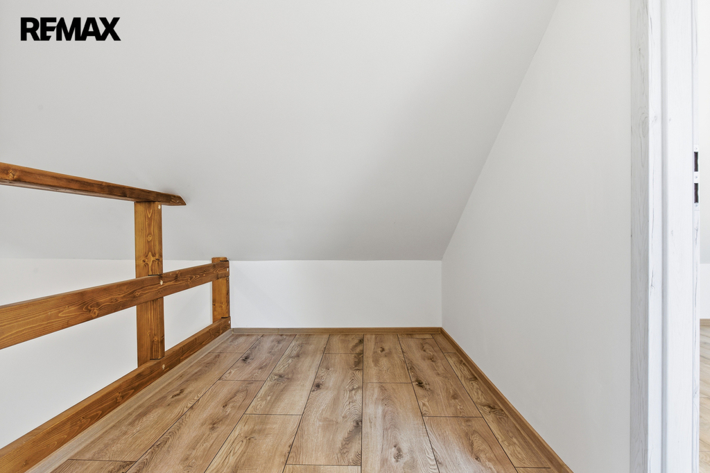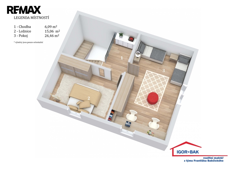 V patře je chodba (6,09 m²), ložnice (15,06 m²) a prostorný pokoj (26,46 m²).