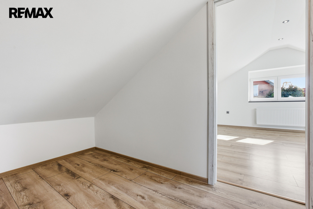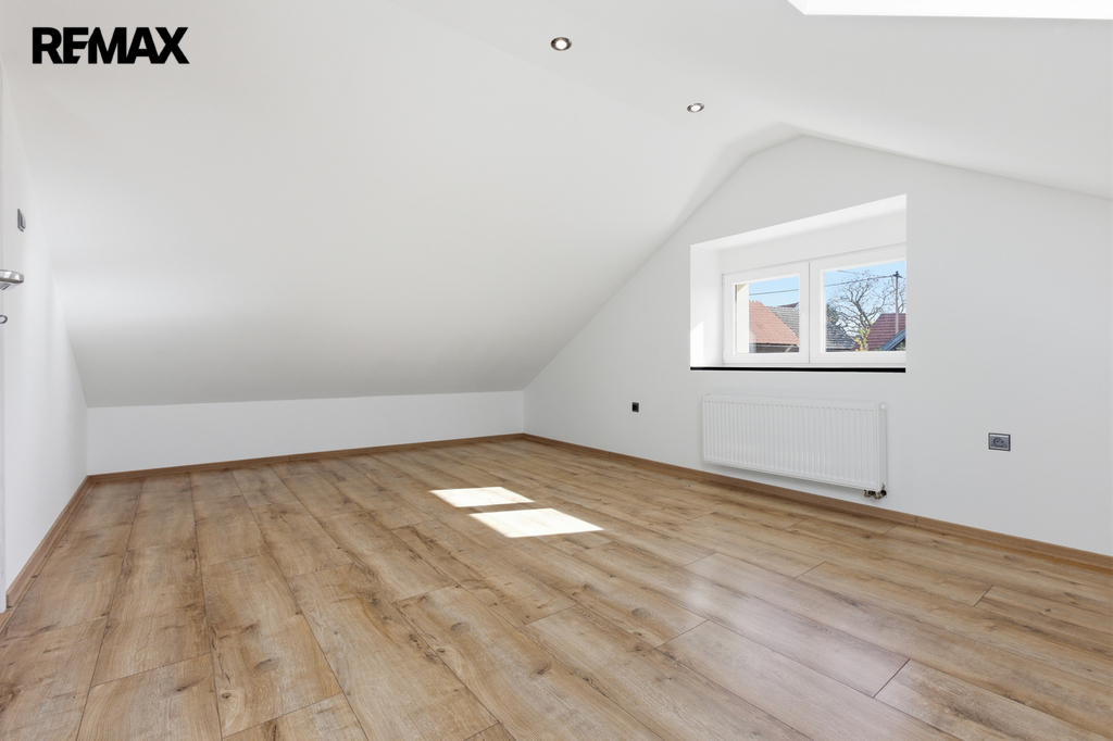 O dostatek světla a tepelný komfort se starají střešní okna Velux s trojsklem (140×90). Vstupní dveře jsou bezpečnostní, připravená je instalace pro kuchyňskou linku i připojení internetu a televize od T-Mobile.