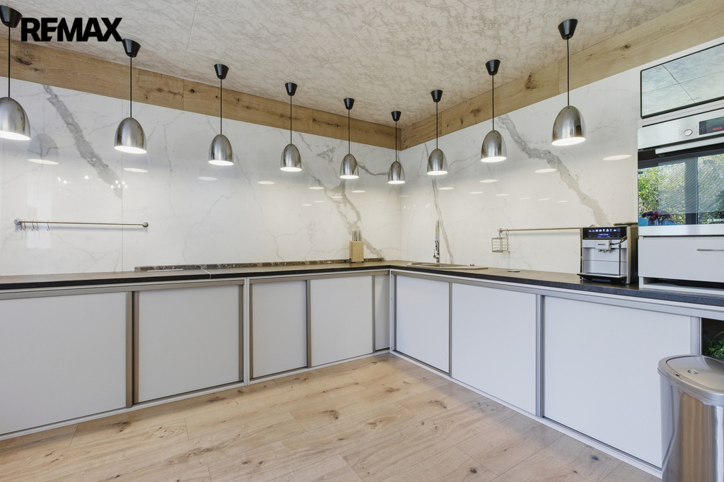 V přízemí hlavní části 4+kk se nachází prostorná kuchyně s jídelnou (35,91 m²), zádveří (3,03 m²), technická místnost (5,89 m²), hobby místnost (19,04 m²), koupelna (4,78 m²) a ateliér (20,91 m²). Kuchyně i přilehlé prostory jsou provedené v moderním stylu s velkoformátovou mramorovou dlažbou 1,5 × 3 m.