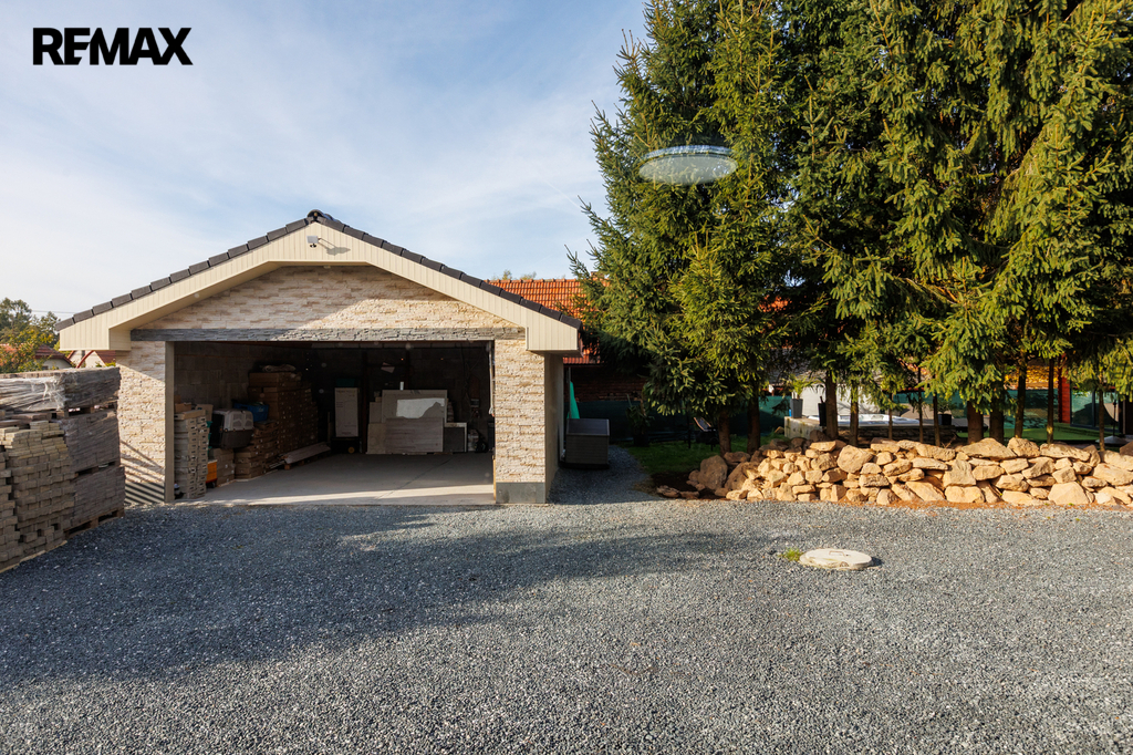 Na pozemku je elektrická vjezdová brána na dálkové ovládání a možnost parkování dalšího vozu před domem. Zahrada 570 m² nabízí altán (24 m²) s posezením, grilem a vířivkou pro čtyři osoby.