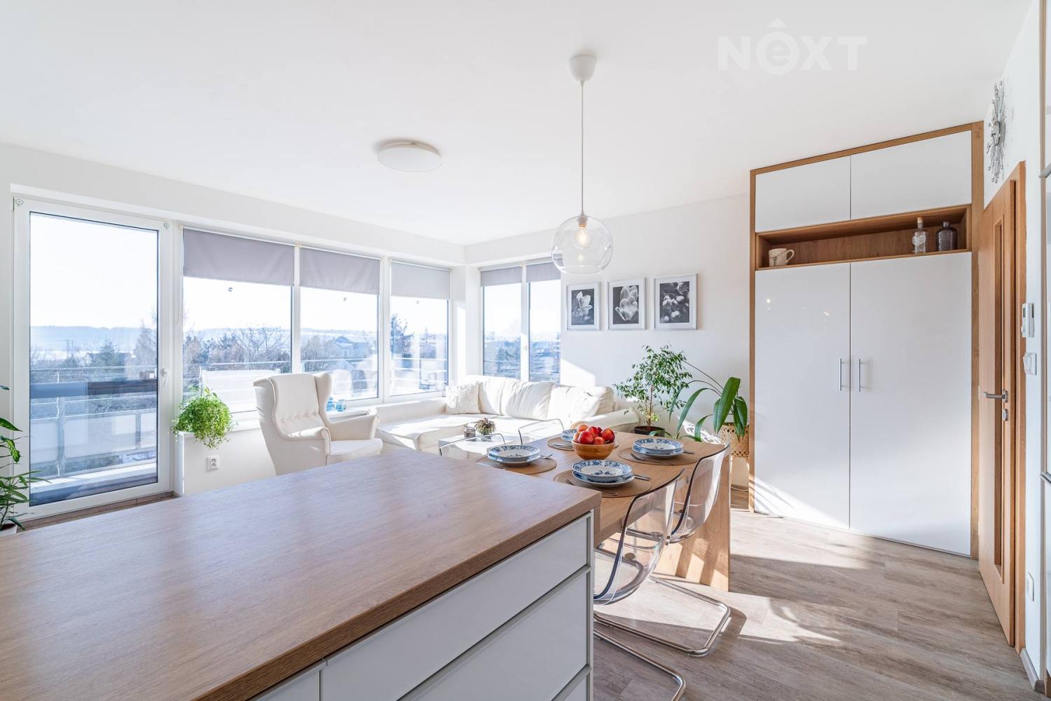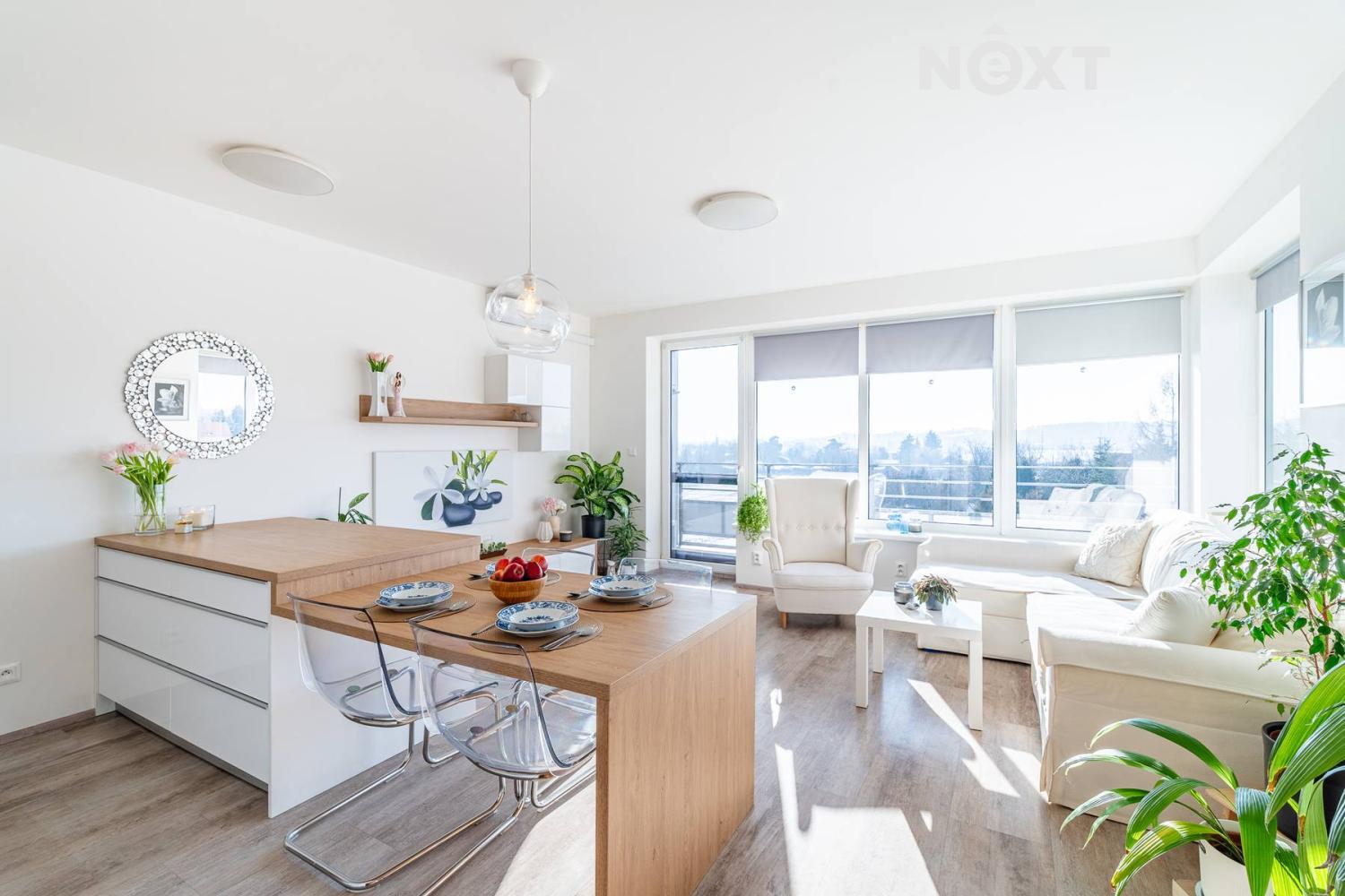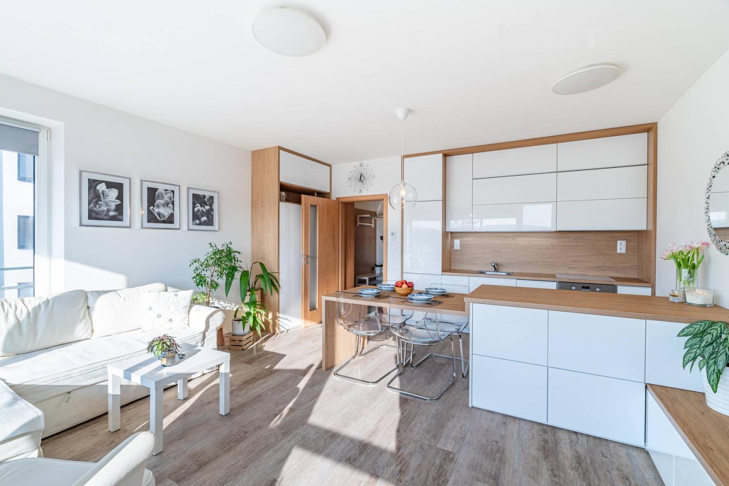 Interiér je řešen ve vysokém standardu s důrazem na pohodlí a funkčnost. Praktická kuchyňská linka s vestavěnými spotřebiči a nábytek na míru v obývacím pokoji jsou součástí prodeje, Podlahové vytápění s vinylovou podlahou a velká okna vytvářejí harmonický celek, ve kterém nic neruší a vše má své místo. Byt působí klidně, moderně a zároveň velmi útulně. O příjemnou teplotu v bytě se stará klimatizace.