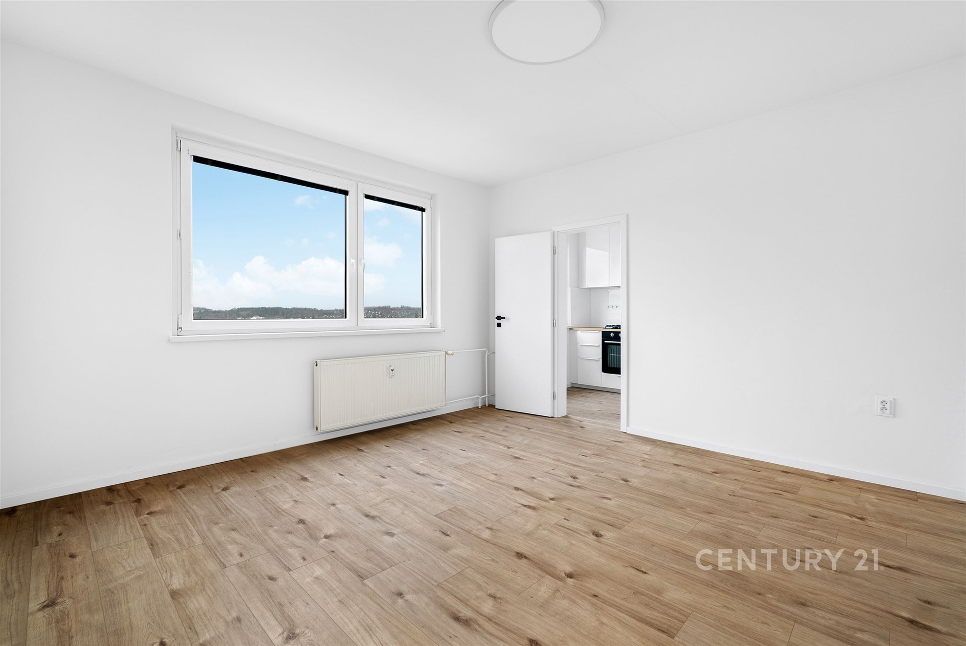 Dispozice bytu se skládá z centrální vstupní chodby (5,8 m2), odkud vede vstup do koupelny s toaletou (4,8 m2), obývacího pokoje (16,1 m2) a ložnice (11,3 m2). Z obývacího pokoje vede dále vstup do kuchyně (5,6 m2). Orientace bytu je na jihozápad a díky umístění ve vyšším patře tak nabízí nerušený výhled.