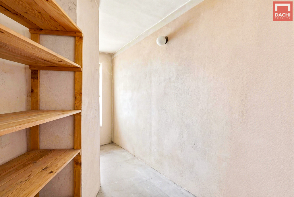 balkón o velikosti cca 8 m² a sklep, který poskytuje praktický úložný prostor, spíž a šatna.
