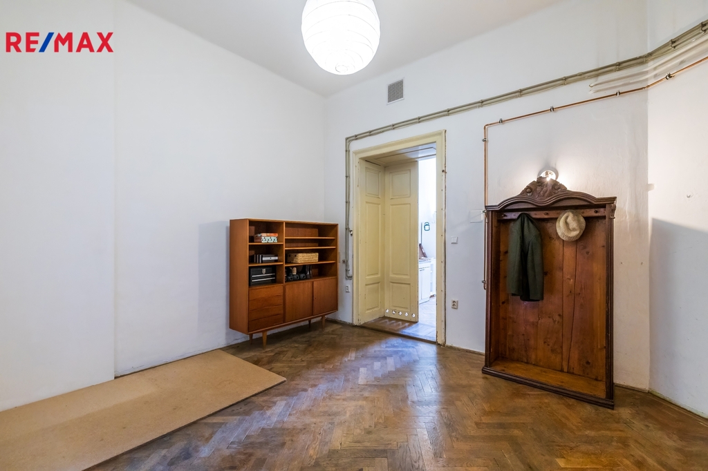 Vysoké stropy, velká okna, původní parkety i historické detaily, které dodávají bytu jedinečný charakter.