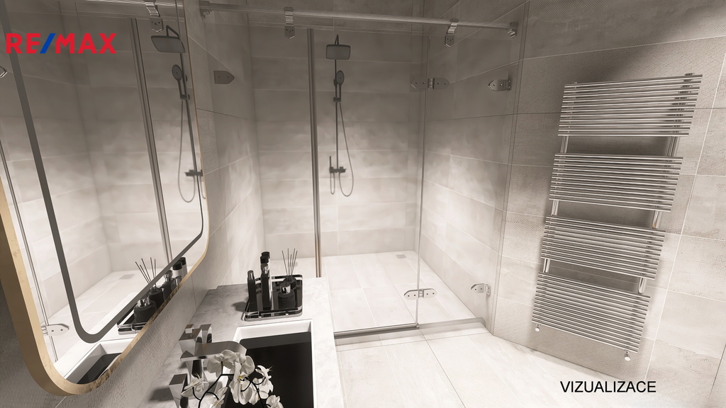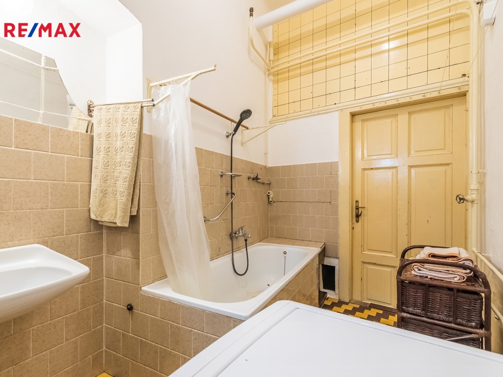 Koupelna o velikosti 6 m² je situována přes společnou chodbu – nabízí se tak možnost jejího funkčního přetvoření například na prostornou prádelnu s dostatkem úložného prostoru.