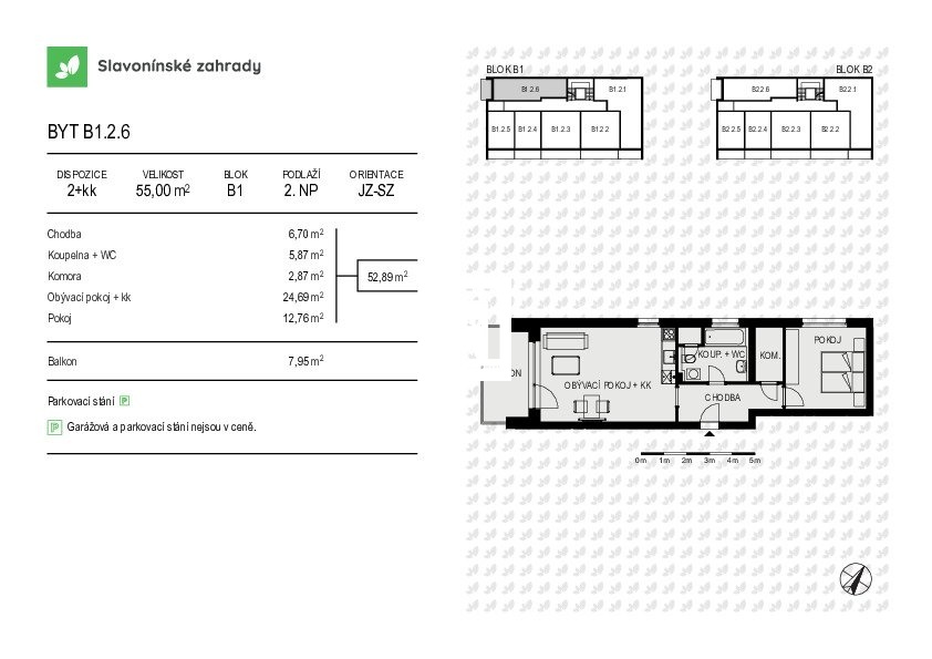 Byt B1.2.6 o dispozici 2+kk má podlahovou plochu 55,0 m² a terasa o velikosti 7,95 m² se nachází ve 2.NP bytového domu s nízkým počtem bytových jednotek.