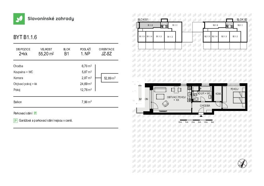 Byt B1.1.6 o dispozici 2+kk má podlahovou plochu 55,15 m², terasa o velikosti 7,9 m² a nachází se v 1.NP bytového domu s nízkým počtem bytových jednotek.