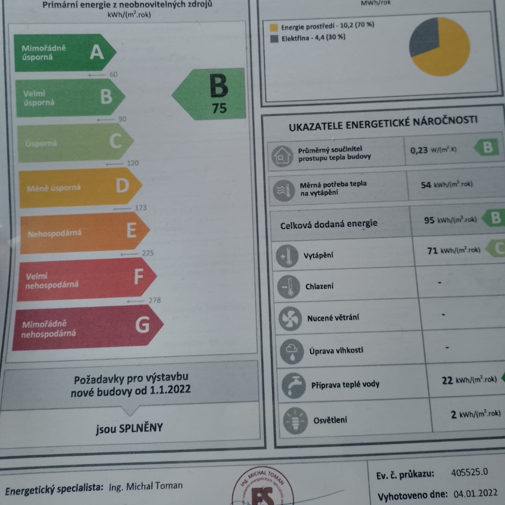 - Ukazatel energetické náročnosti budovy: 75 kWh/m²