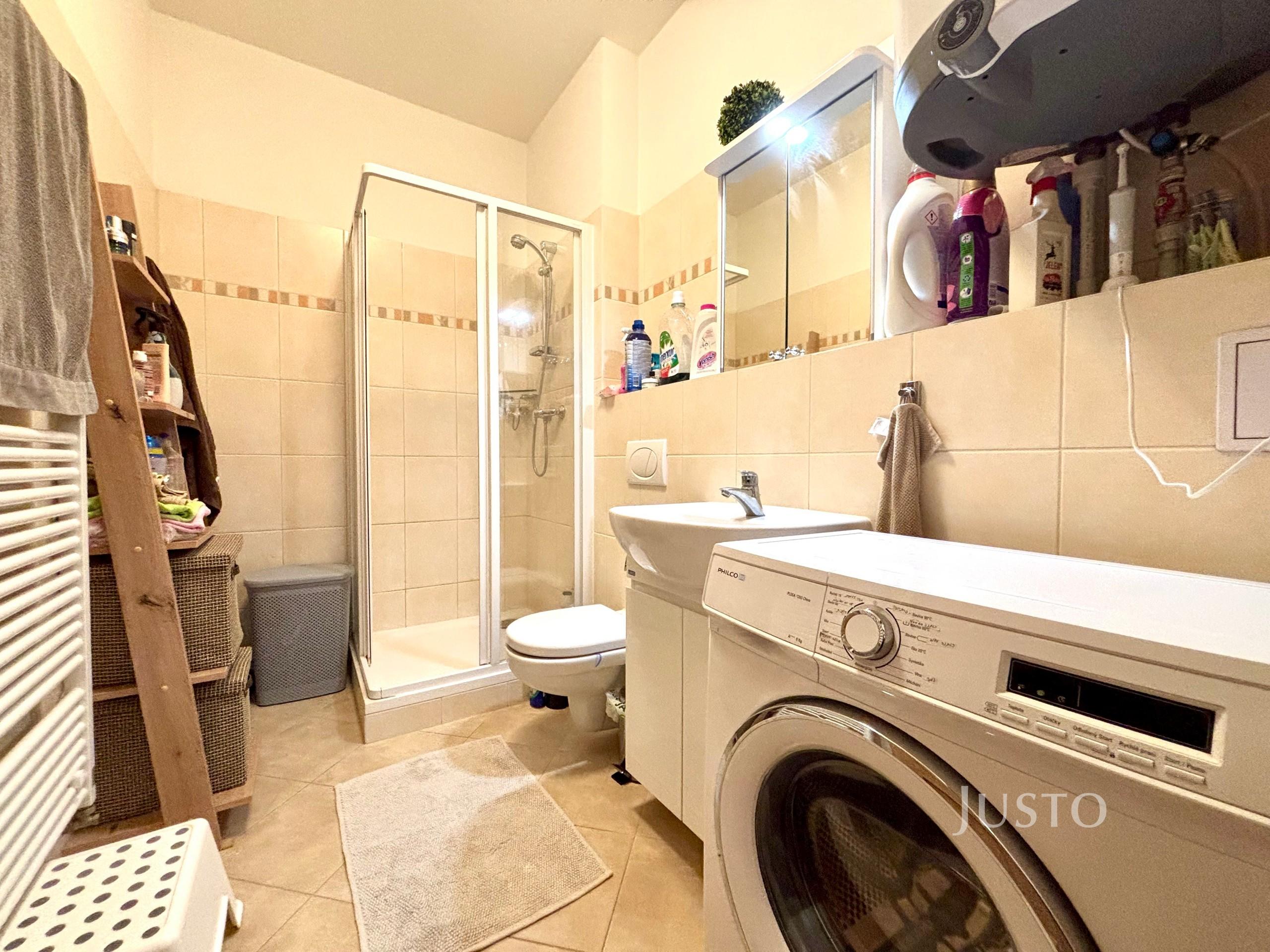 Koupelna s oknem (výhoda větrání) je vybavena sprchovým koutem, toaletou, pračkou a topným žebříkem.