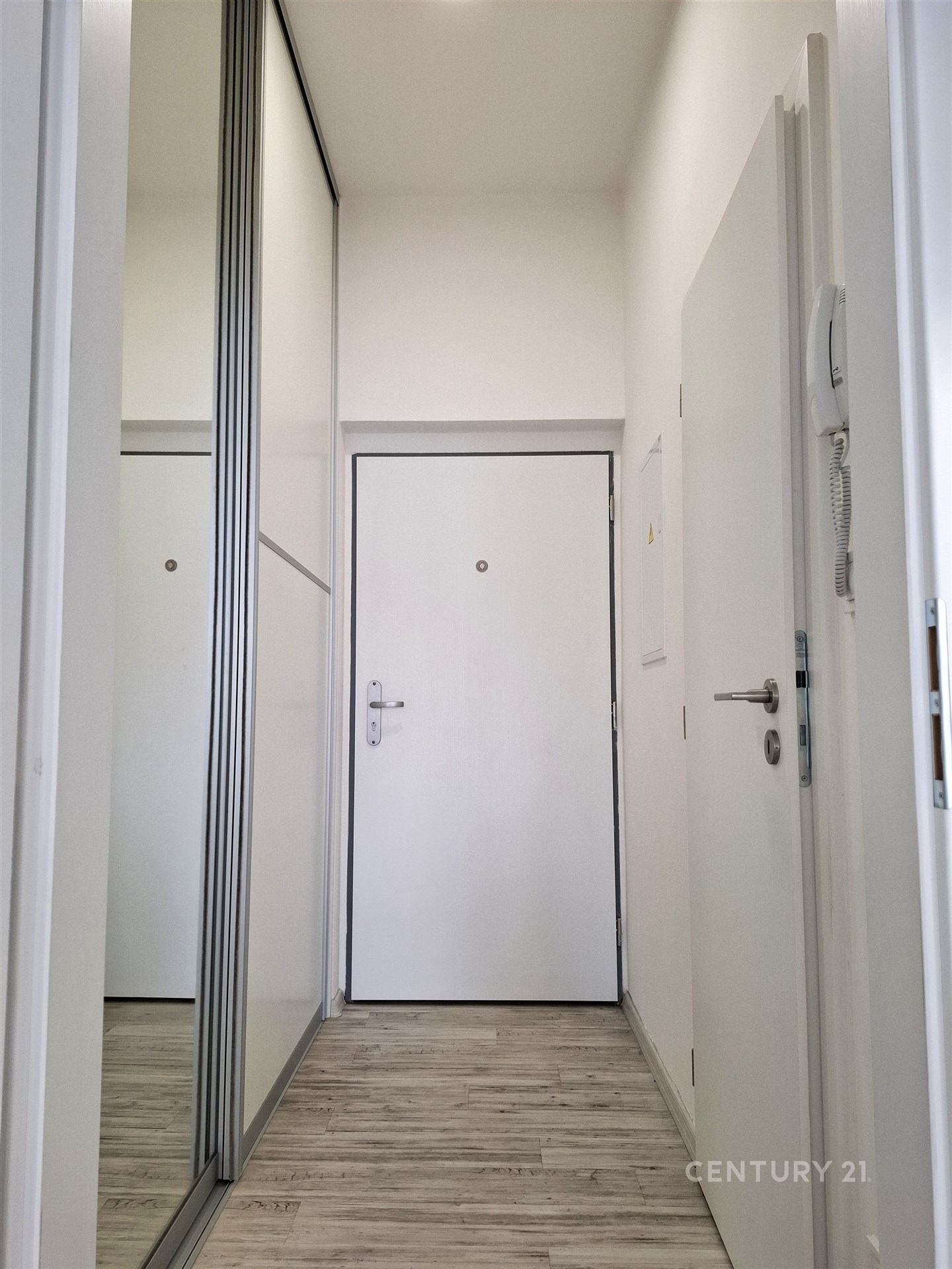 Po vstupu do bytu se dostáváme do chodby, kde po pravé straně je prostorná vestavěná skříň. Na pravé straně se nachází moderní koupelna s wc a sprchovým koutem. Je zde pamatováno na pračku, díky vysokým stropům je bezproblémové umístit také sušičku. V obytné místnosti je moderní kuchyňská linka s varnou deskou a elektrickou troubou. Odtah par je pomocí vestavěné digestoře. Kuchyňská linka je osvětlená stylovým LED osvětlením. Z této místnosti je vstup na balkon. K dispozici také skladovací kóje, která je umístěna na stejném podlaží jako byt.
