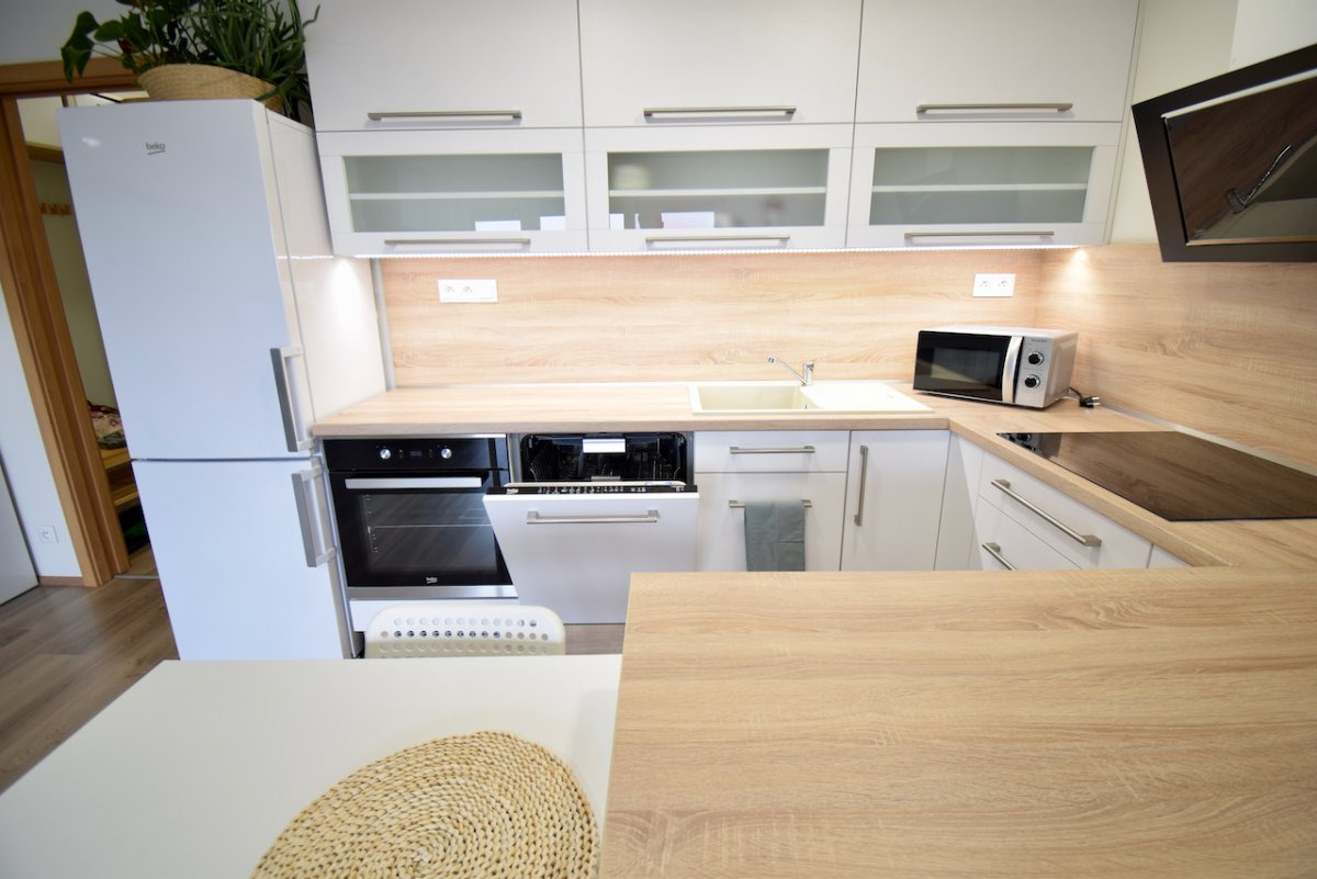 Byt se nabízí plně vybavený. Okna jsou vybaveny předokenními roletami. Kuchyně disponuje všemi spotřebiči vč. myčky. Vybavení bytu zůstává jako na fotografiích.