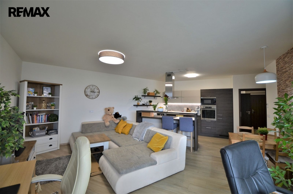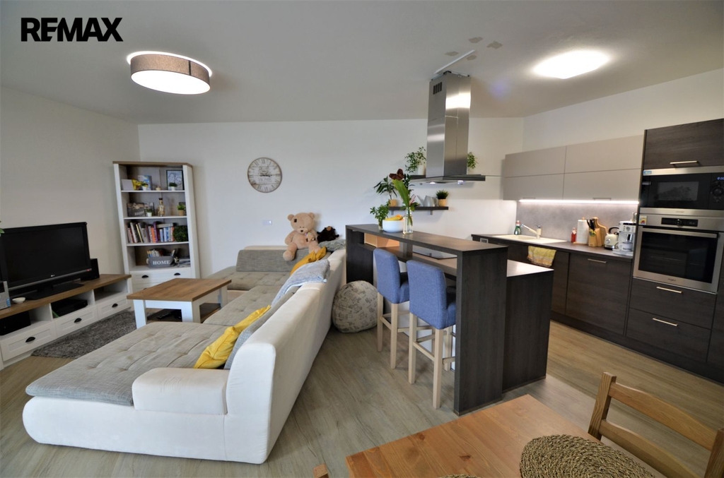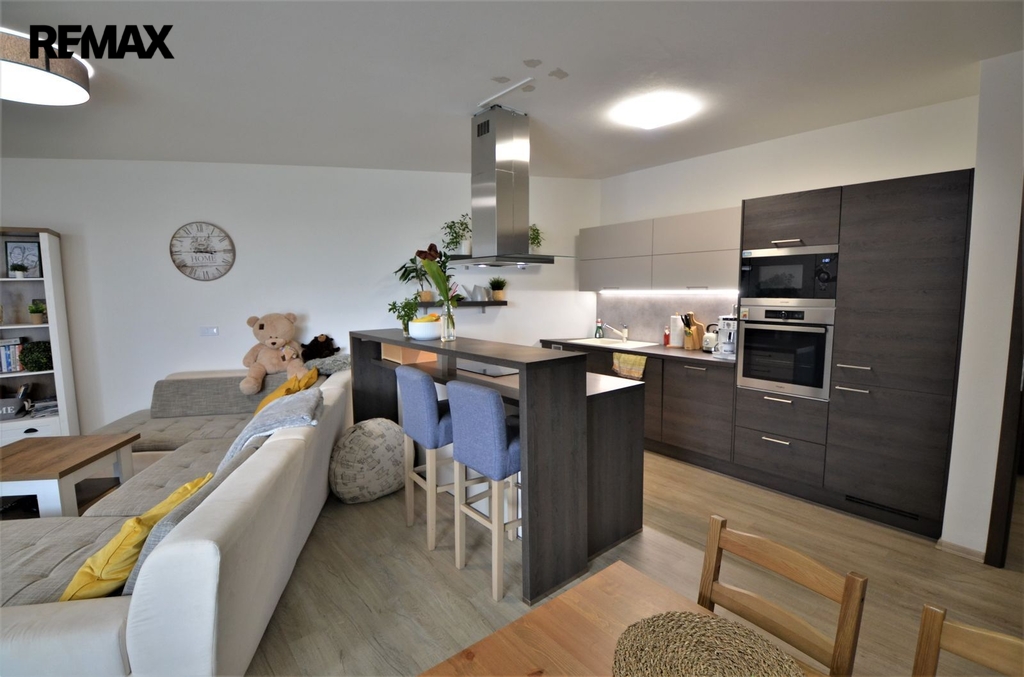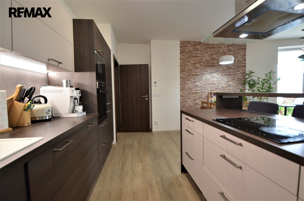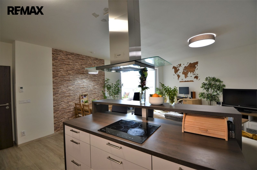 - Obývací pokoj s kuchyňským koutem, vybaveným moderní kuchyňskou linkou s vestavnými spotřebiči: lednice s mrazákem, elektrická trouba, mikrovlnná - trouba, myčka, indukční varná deska s cirkulační digestoří umístěnou na kuchyňském ostrůvku