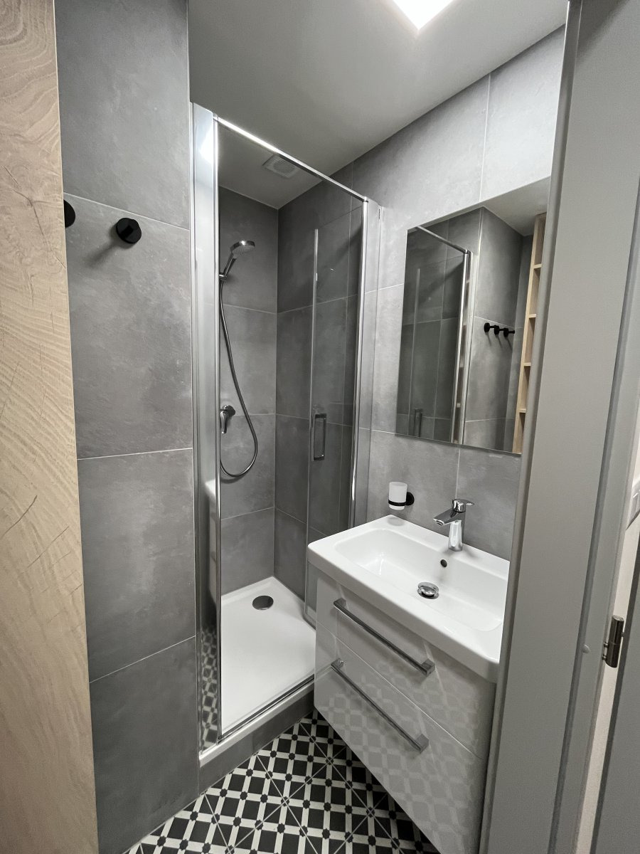 Při vstupu do bytu uvidíte prostornou chodbu s úložným prostorem a vstupy do jednotlivých místností. Dispozice nabízí koupelnu s umyvadlem, sprchovým koutem, úložnými prostory. Toaleta se nachází zvlášť.
