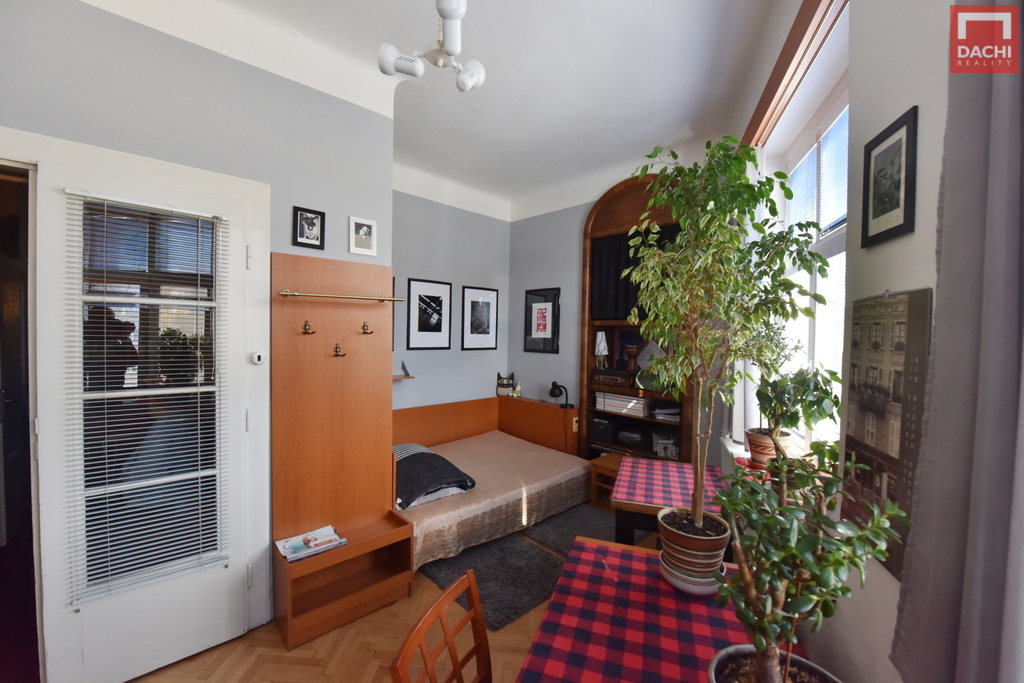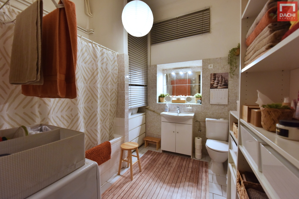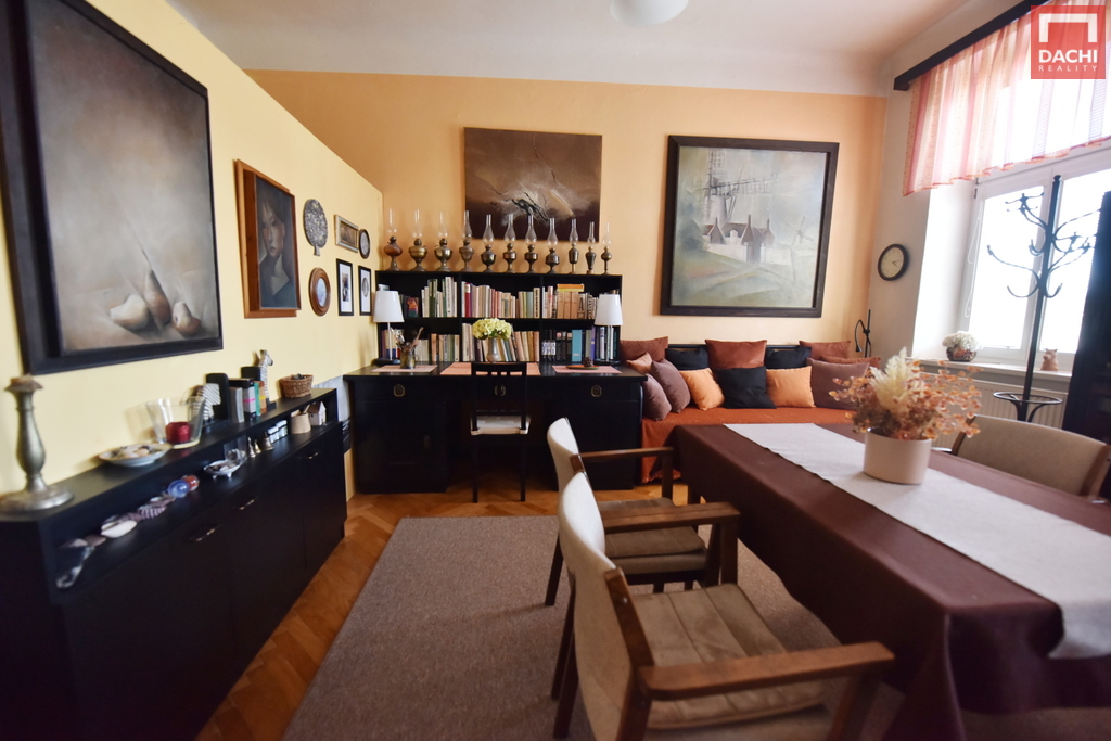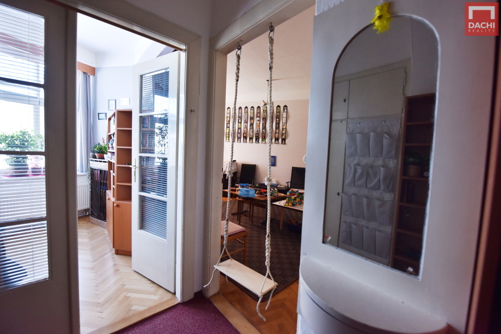 Interiér nabízí velké a světlé místnosti s dostatkem prostoru pro pohodlné bydlení. Původní dveře dodávají bytu osobitý charakter a příjemnou atmosféru.