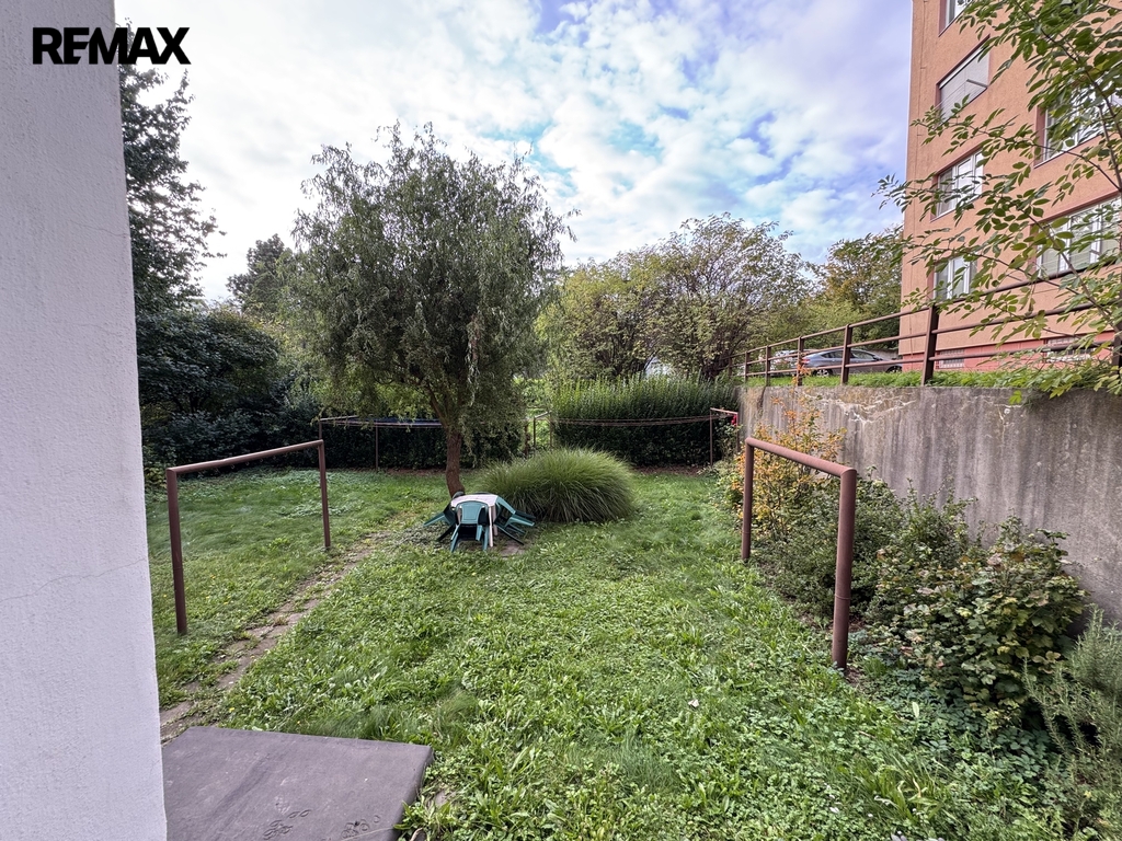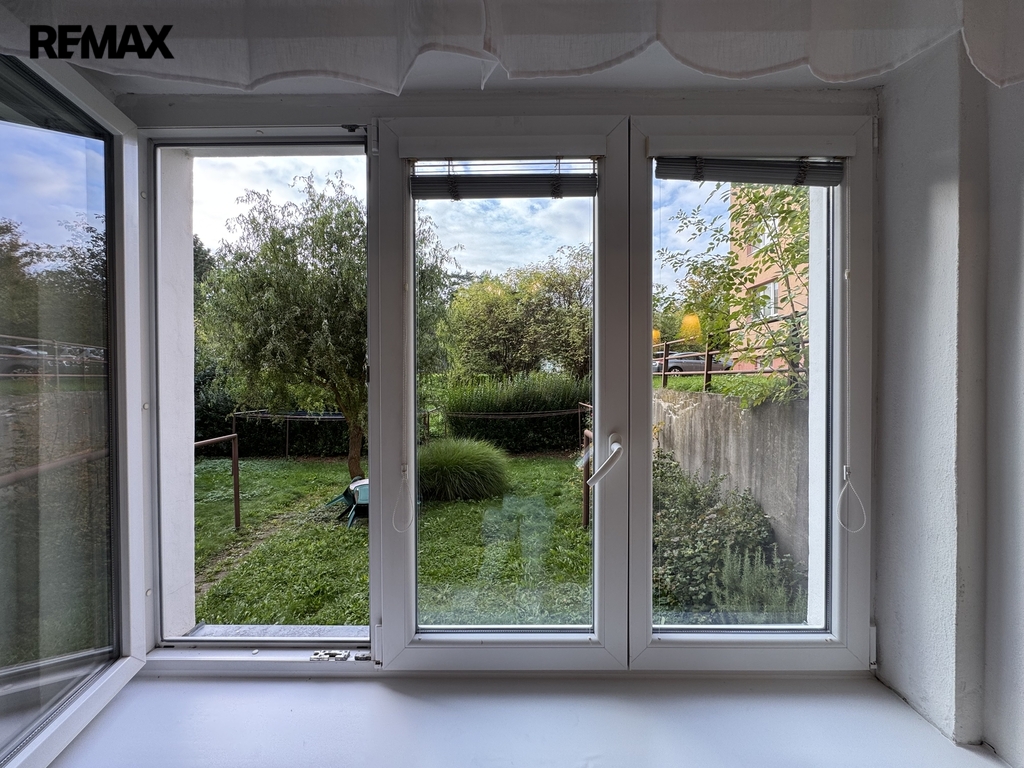 Díky západní orientaci a výhledu do zahrady bytového domu působí byt světlým a klidným dojmem.