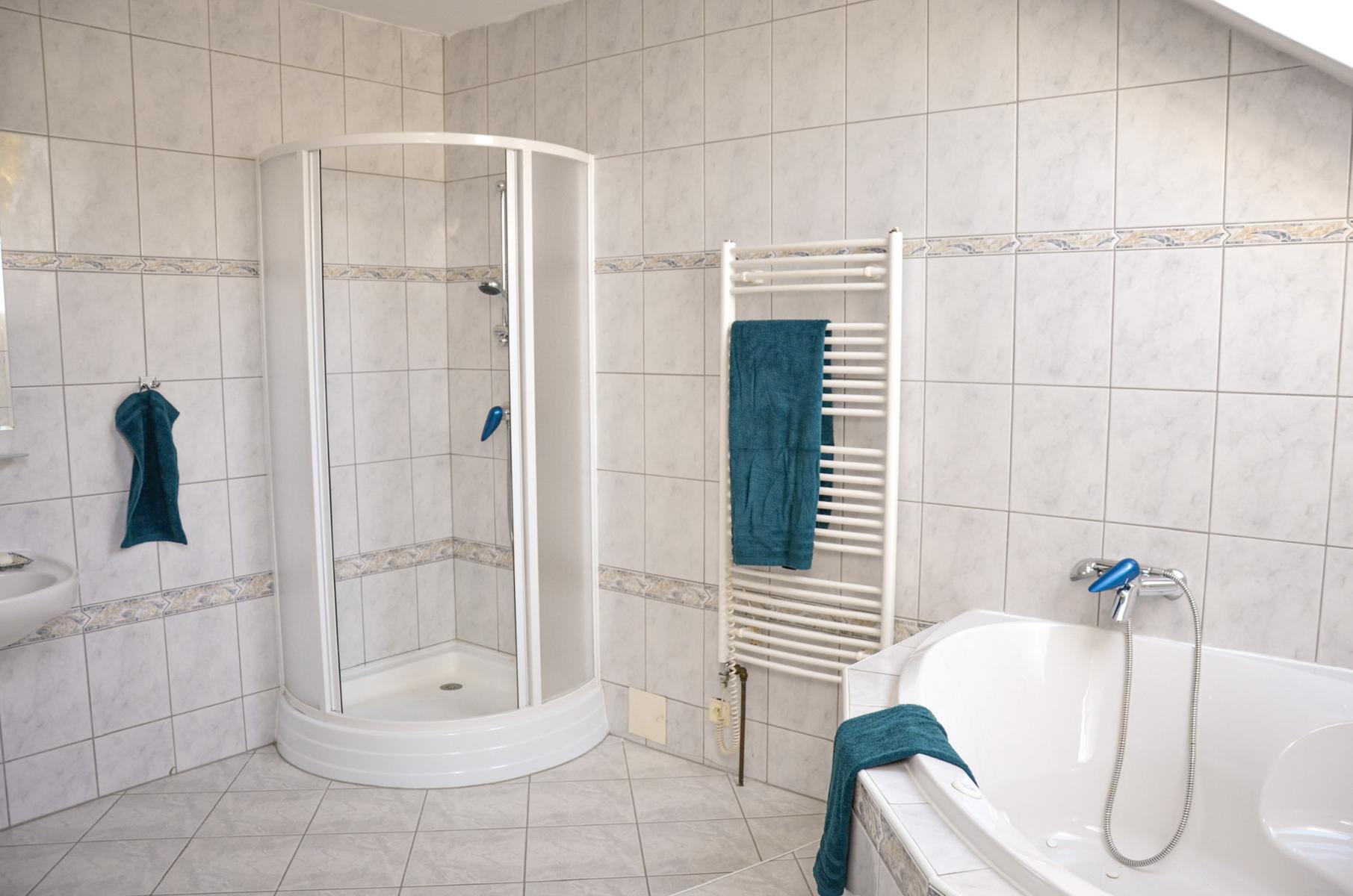 Podlahové vytápění v obývacím pokoji, kuchyni, koupelnách i chodbách.