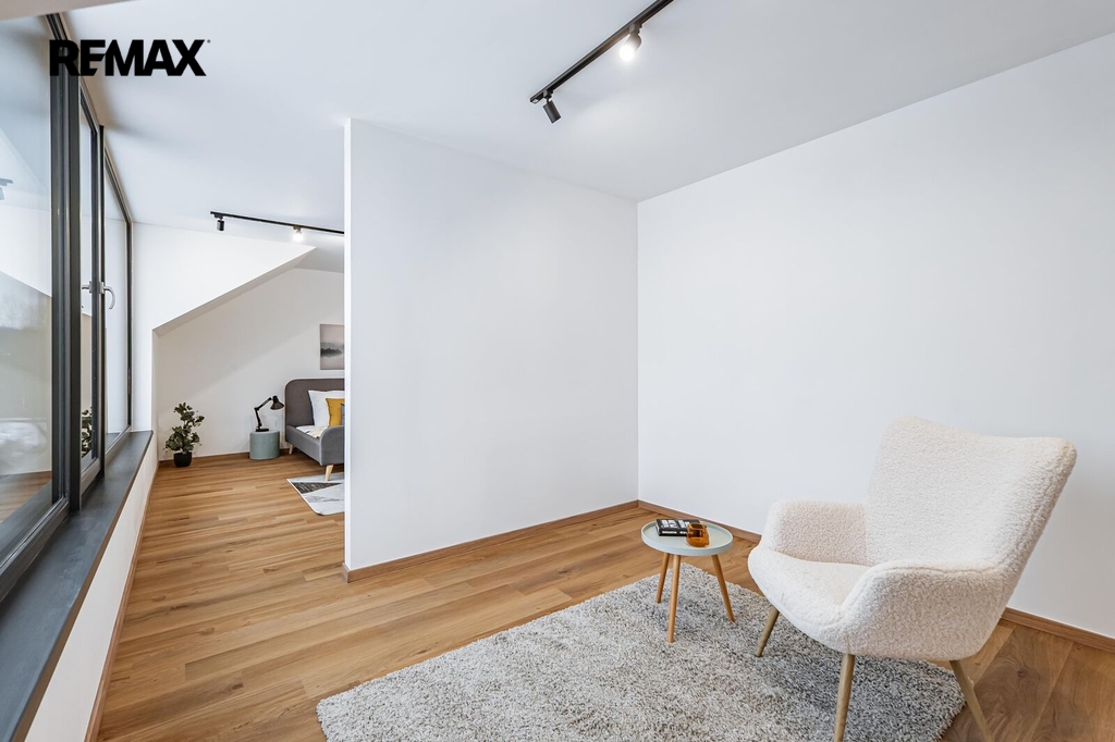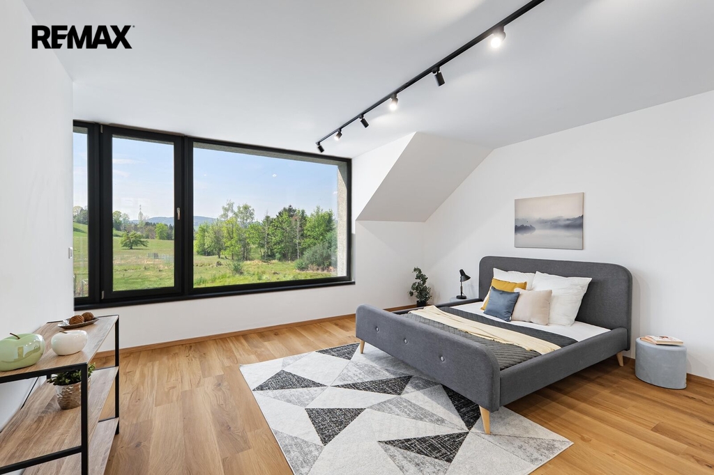 Interiér je prosvětlen velkoformátovými okny, která zajišťují výjimečné množství denního světla a vytvářejí pocit prostoru a blízkosti s přírodou. Západní orientace nabízí krásné výhledy i příjemné večerní světlo. V přízemí se nachází opravdu prostorný obývací pokoj o velikosti téměř 50 m² s přípravou na kuchyň a přímým vstupem na terasu, dále pracovna, koupelna se sprchovým koutem, technická místnost a komora. V patře jsou umístěny tři ložnice, z nichž dvě mají vlastní prostornou šatnu, a velká koupelna s vanou, bidetem a dvojumyvadlem.