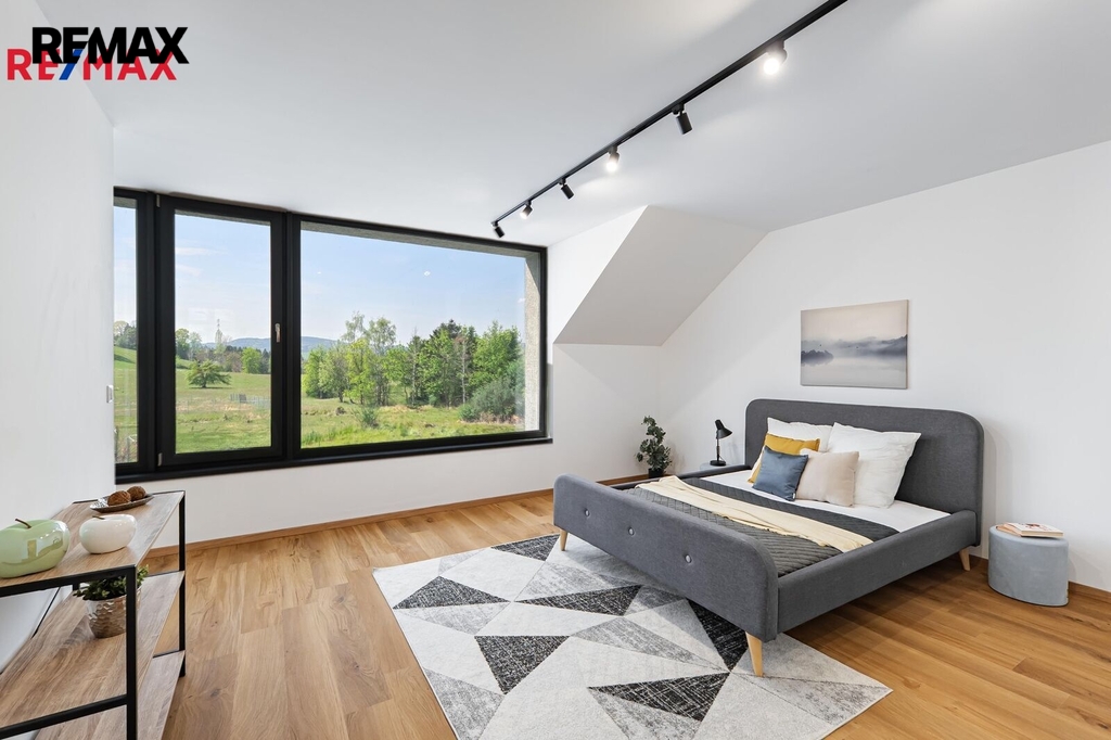 Interiér je prosvětlen velkoformátovými okny, která zajišťují výjimečné množství denního světla a vytvářejí pocit prostoru a blízkosti s přírodou. Západní orientace nabízí krásné výhledy i příjemné večerní světlo. V přízemí se nachází opravdu prostorný obývací pokoj s přípravou na kuchyň a přímým vstupem na terasu, dále pracovna, koupelna se sprchovým koutem, technická místnost a komora. V patře jsou umístěny tři ložnice, z nichž dvě mají vlastní prostornou šatnu, a velká koupelna s vanou, bidetem a dvojumyvadlem.