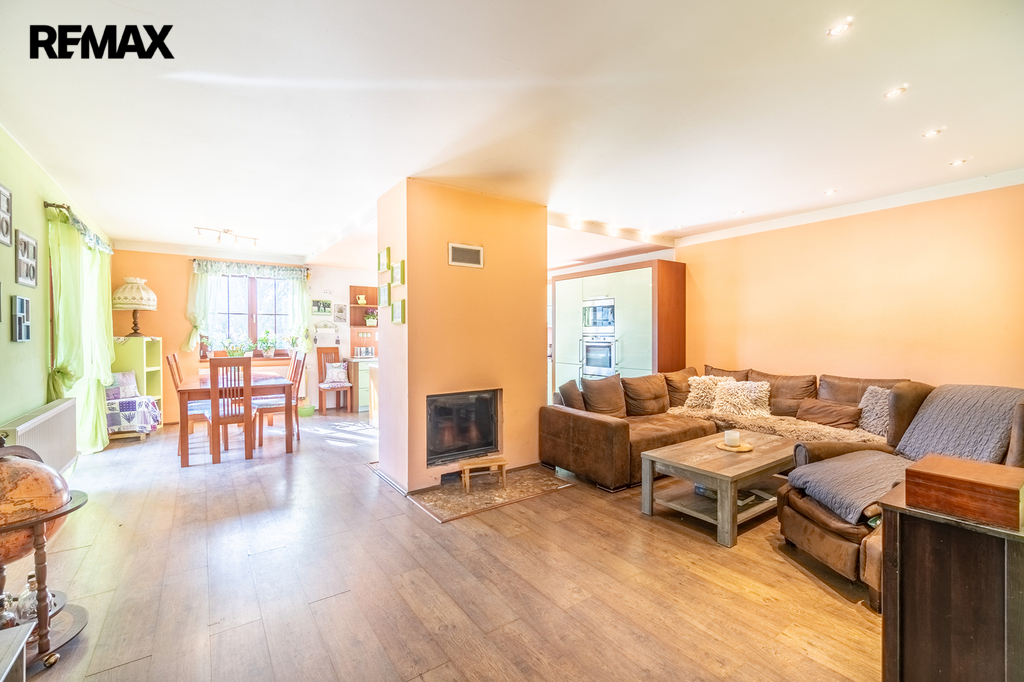 Srdcem domu je prostorný obývací pokoj propojený s kuchyní a jídelnou, kde dominuje krb, který dodává prostoru útulnou atmosféru zejména během chladných večerů. Samostatné pokoje a koupelny umožňují pohodlné vícegenerační bydlení, aniž by se někdo cítil omezený.