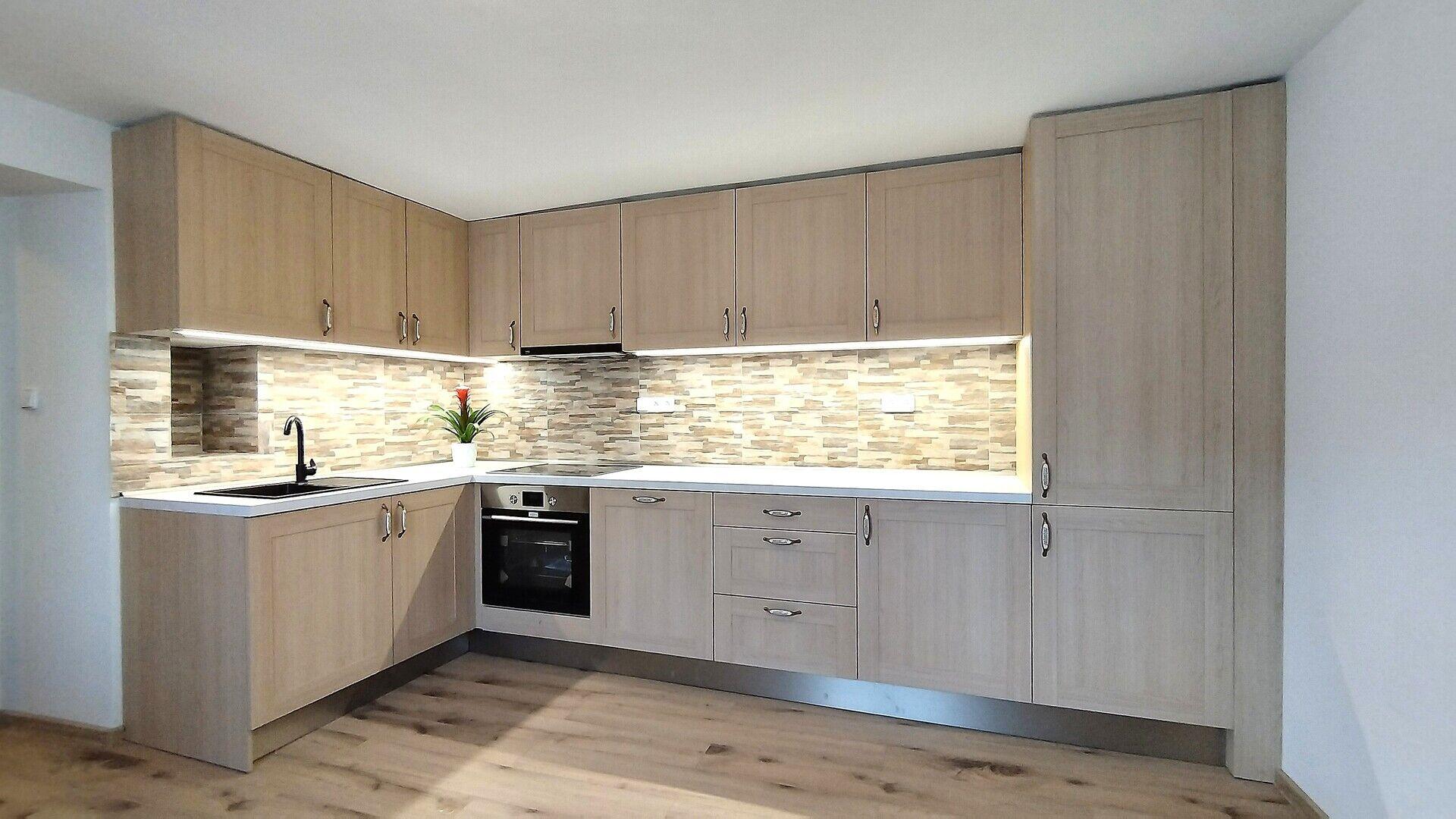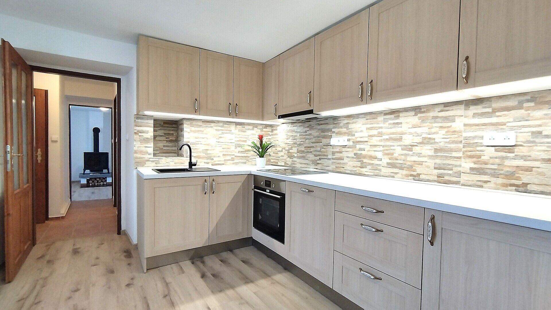 Moderní kuchyně vybavena novými vestavnými spotřebiči: elektrický sporák se sklokeramickou varnou deskou a horkovzdušnou troubou, výsuvná digestoř, myčka nádobí, lednice, mraznička. V kuchyňské lince je místo pro připojení pračky.