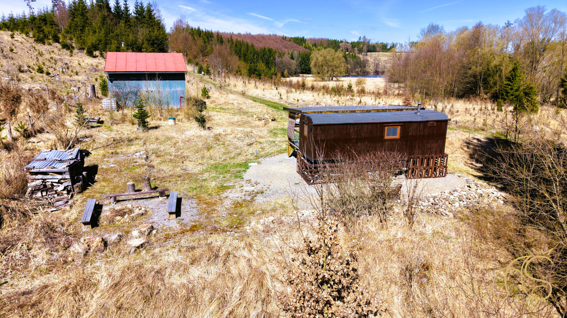 Na jednom ze stavebních pozemků se nachází nově upravená maringotka s terasou. V maringotce je ložnice se dvěma lůžky, obývací prostor s kuchyňkou a koupelnou se sprchovým koutem a toaletou. Vytápění zajišťuje tepelné čepadlo.