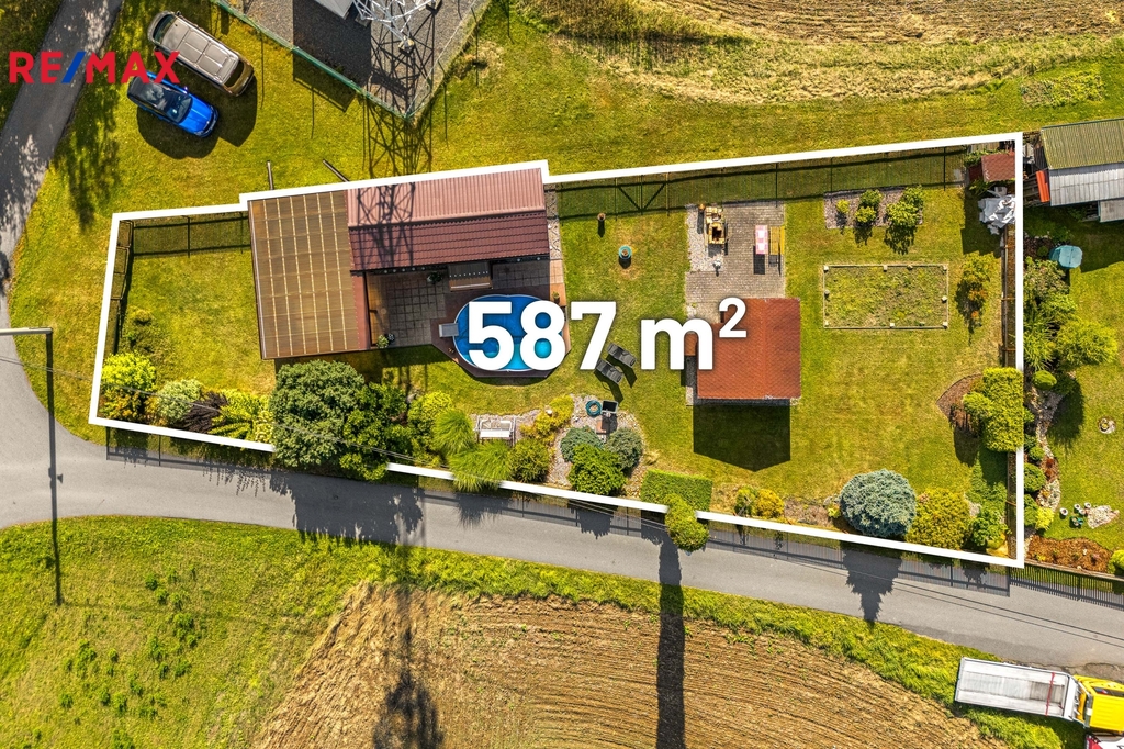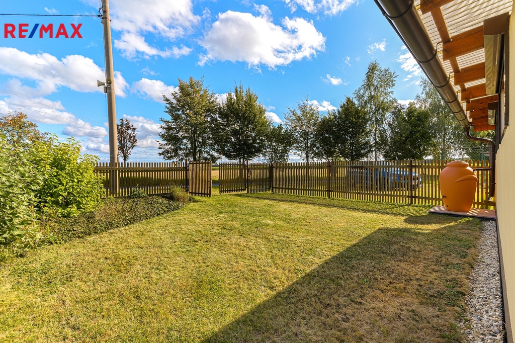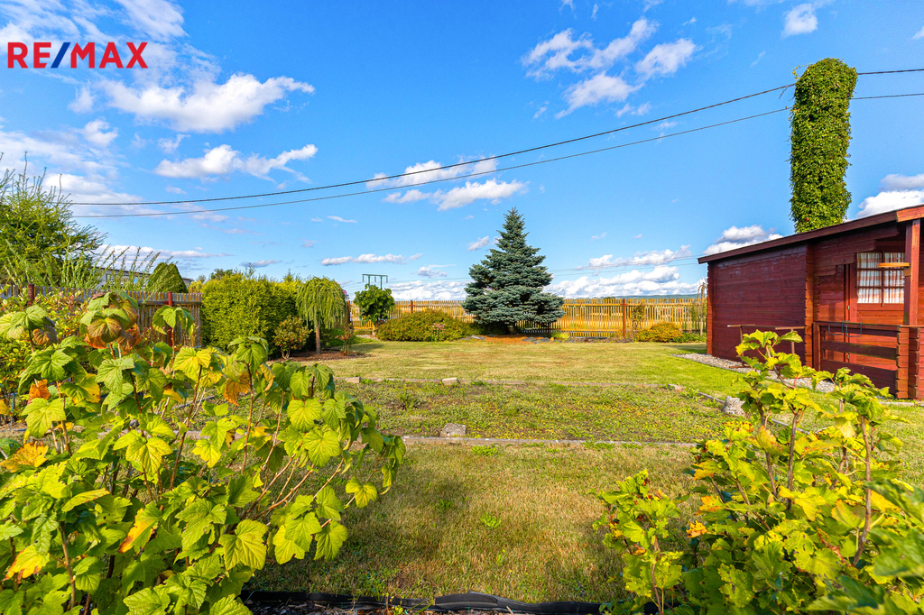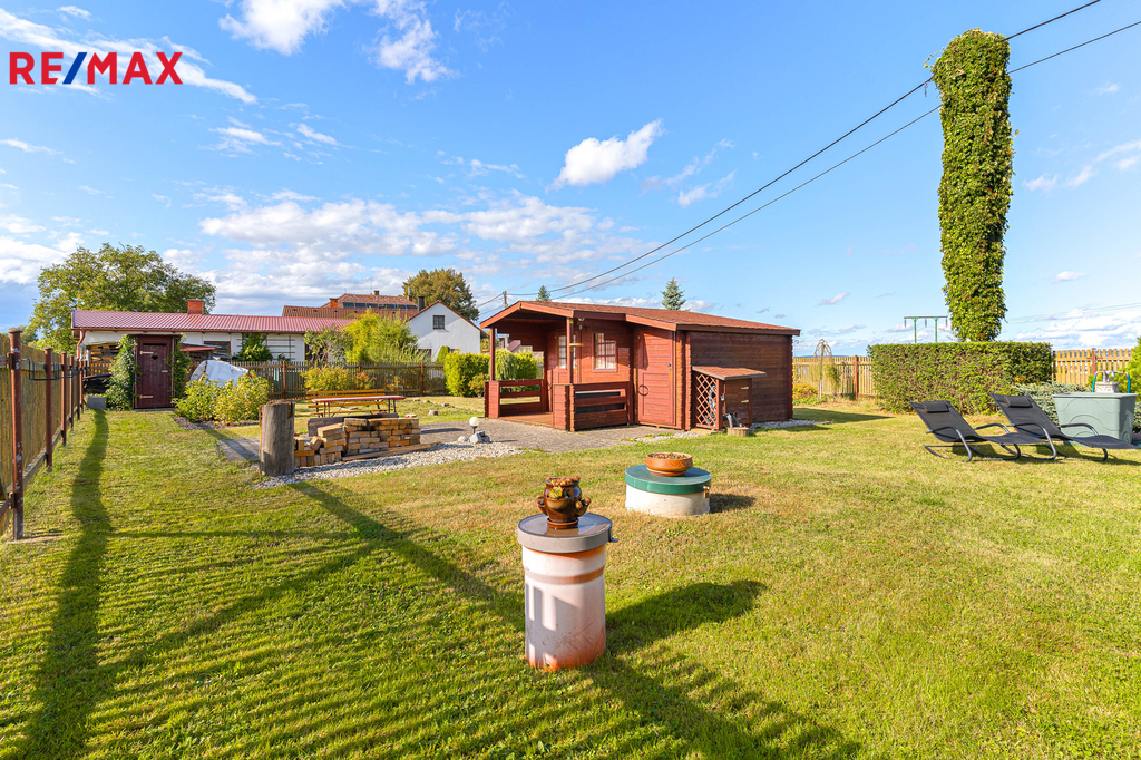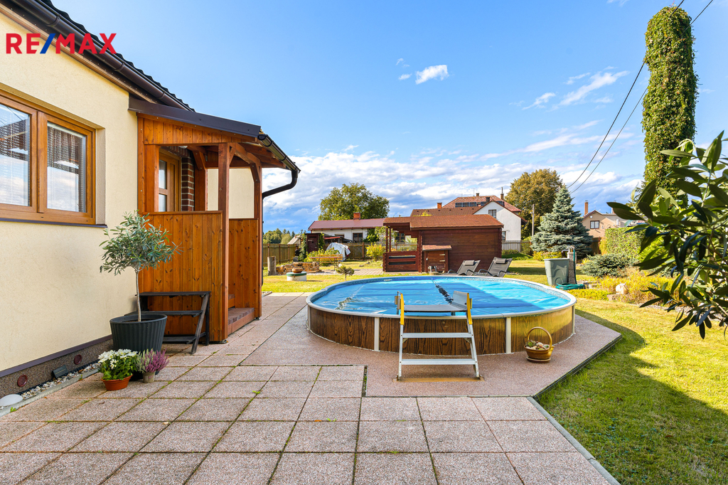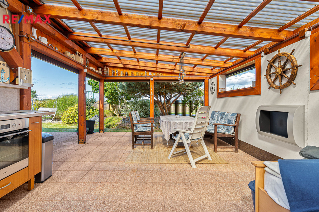Díky elektrickým roletám lze pergolu snadno uzavřít a využívat ji i za horšího počasí. Na zahradě je bazén o ploše 20 m2, který v létě potěší děti i dospělé. Okrasné záhony, skalka, vzrostlé keře a stromy dotvářejí příjemnou atmosféru. Vše efektivně doplňuje zahradní domek o velikosti cca 14 m2, který může sloužit jako místo pro hosty nebo sklad zahradního náčiní.