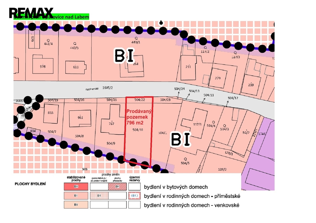 ✅ Celková plocha pozemků činí 796 m². V územním plánu jde o oblast pro bydlení v rodinných domech příměstské - v ploše BI. Ta je určena pro zástavbu rodinných domů o 1 nadzemním podlaží s možností obytného podkroví. Koeficient zastavění stavebního pozemku nepřevýší hodnotu 0,6.
