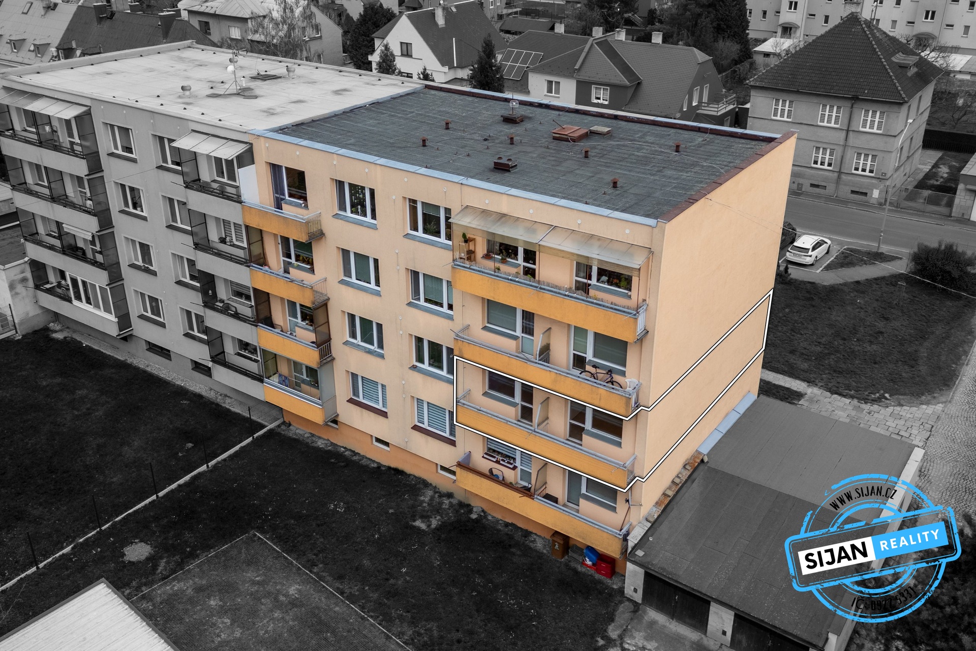 obývací pokoj s výstupem na balkón, pokoj s výstupem na balkón, ložnice, kuchyně, komora, samostatné WC, koupelna (vana) a předsíň.