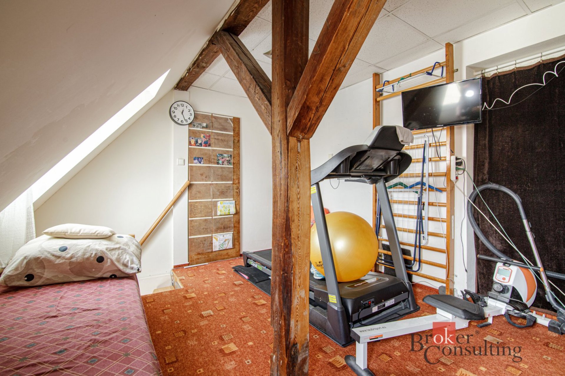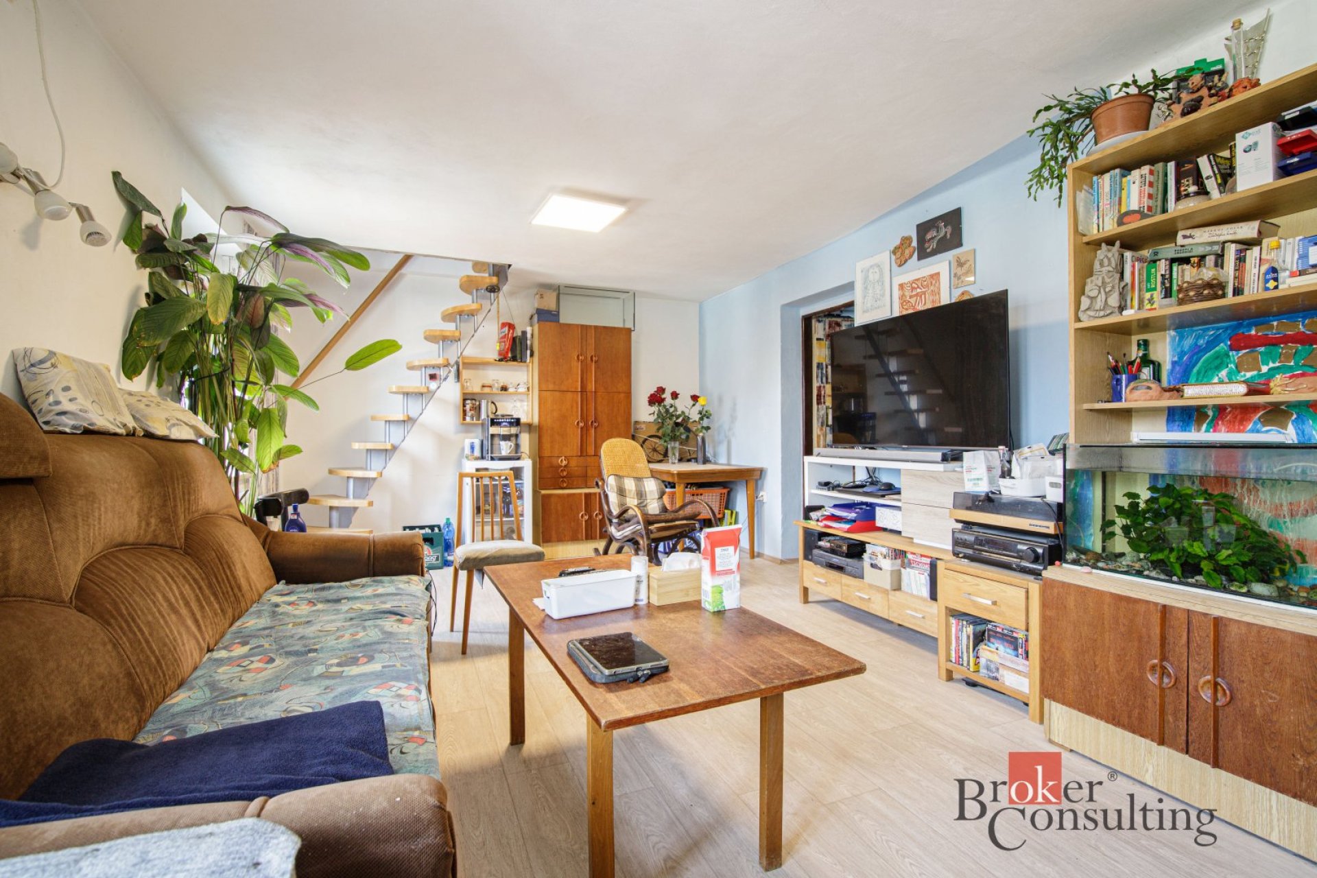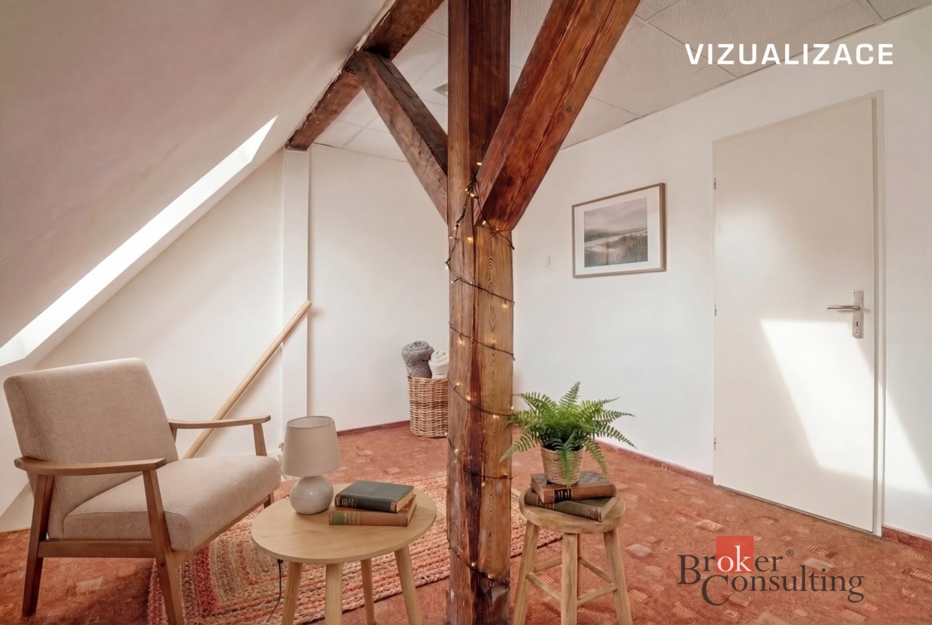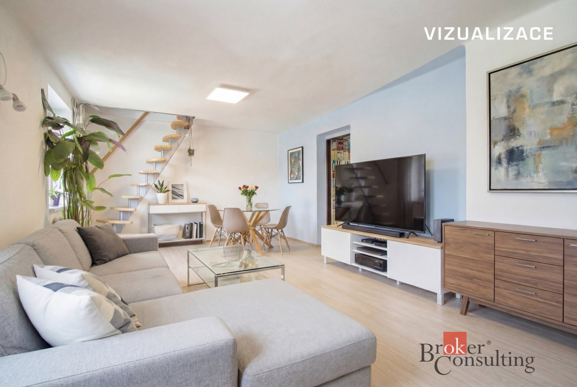 Horní patro (mezonetová část) tvoří samostatný pokoj, který je ideální jako tichá pracovna, ložnice pro hosty nebo "ateliér", což dokreslují původní trámy. Byt má samostatné vytápění novým plynovým kondenzačním kotlem, avšak je určený k rekonstrukci. Z tohoto důvodu je v rámci inzerce prezentován převážně formou vizualizací.